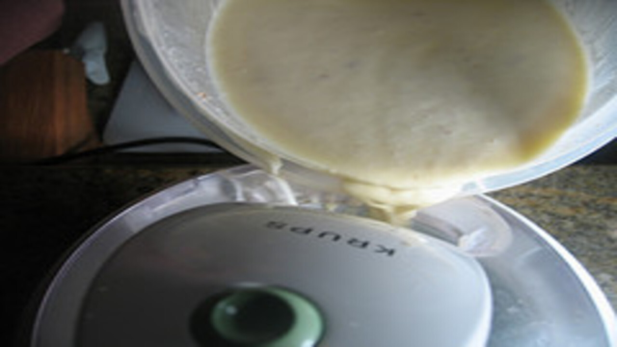 Once the liquid mixture has reached about 130F degrees, begin to temper the egg mixture. Do this by adding a ladle full of the hot liquid to the eggs while whisking. This will prevent the eggs from cooking. You are slowly bringing them up to the temperature of the hotter liquid; this ensures you don’t have scrabbled eggs in your ginger ice cream. Continue to add a ladle full at a time of the hot cream until you’ve added about half the cream to the egg-sugar mix.