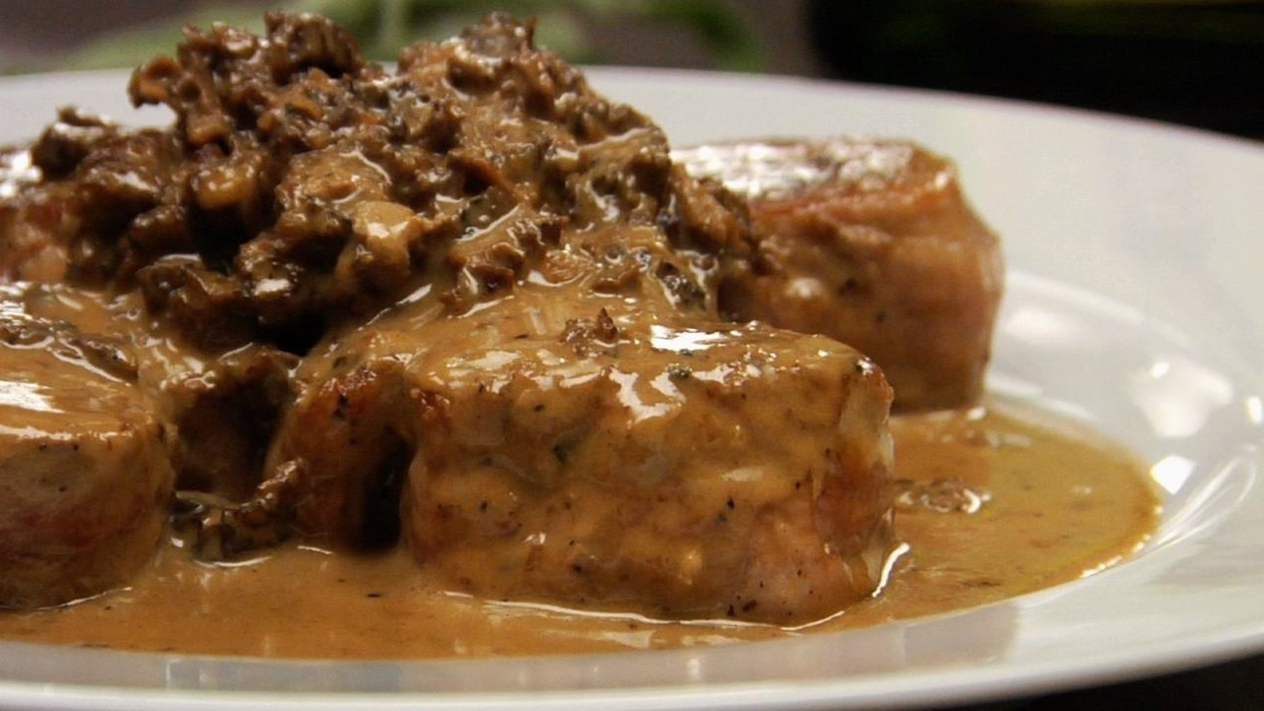 To prepare the pork, trim off any excess fat and silverskin. Then cut it into about 1" -inch thick medallions. Lightly press down on the pork just to flatten and even it out a bit. Place the medallions onto a cooling rack and let them temper while you soak the mushrooms.