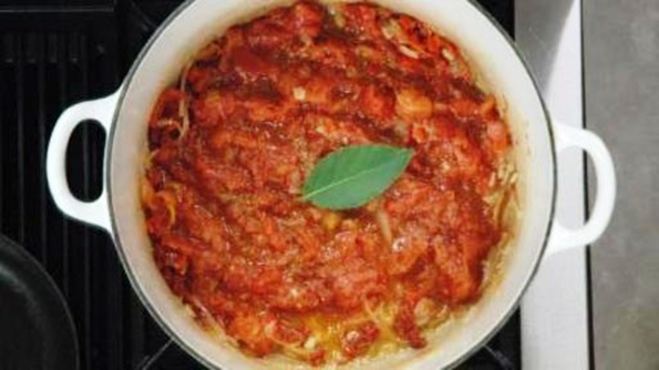 Once the wine has reduced, add the sun-dried tomatoes, spicy peppers and chopped tomatoes. Stir everything together and add the bay leaves. Lower the heat if the sauce starts to splatter.