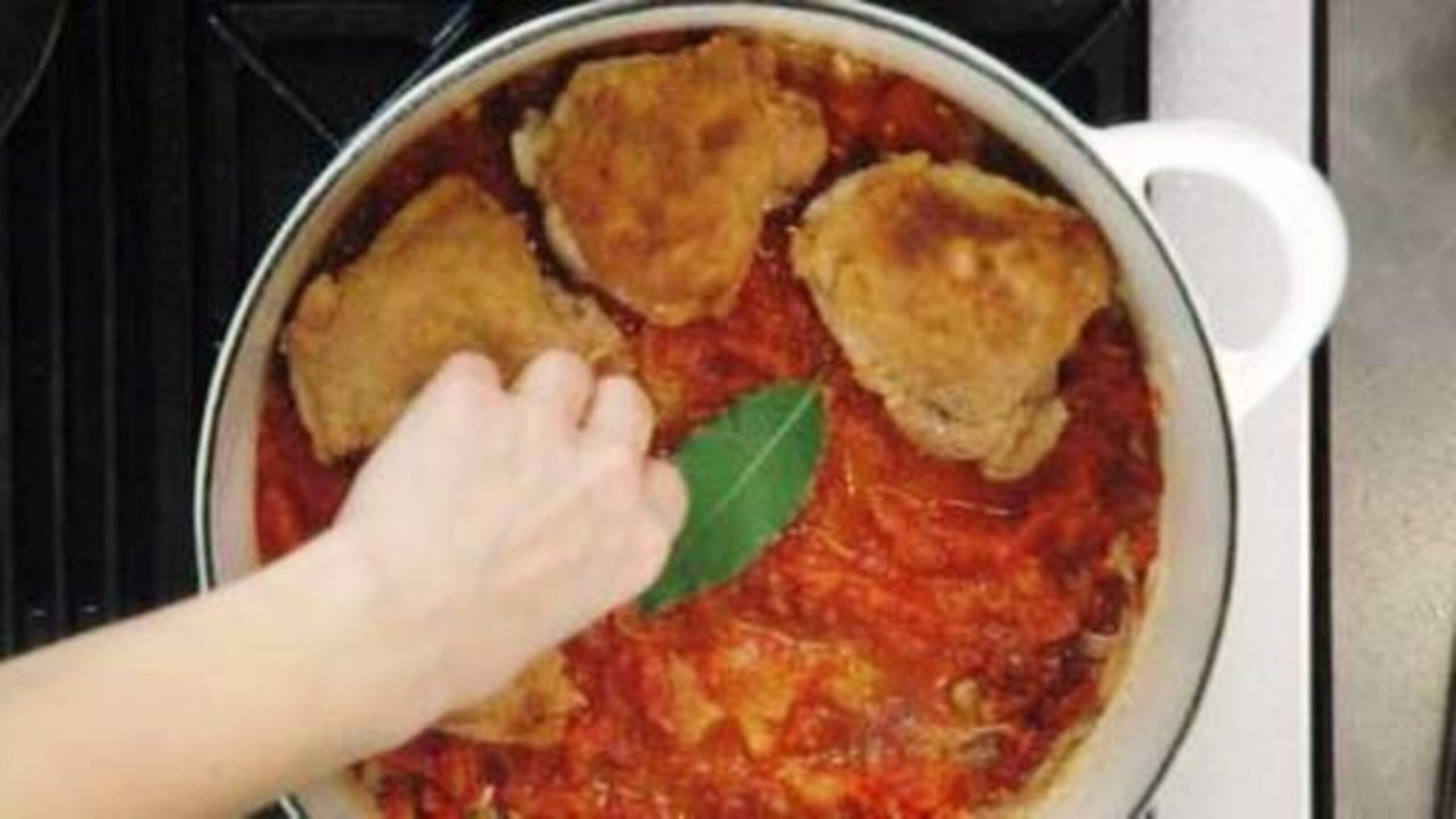 To assemble the dish, place the chicken skin-side up onto the sauce (preferably in a single layer).