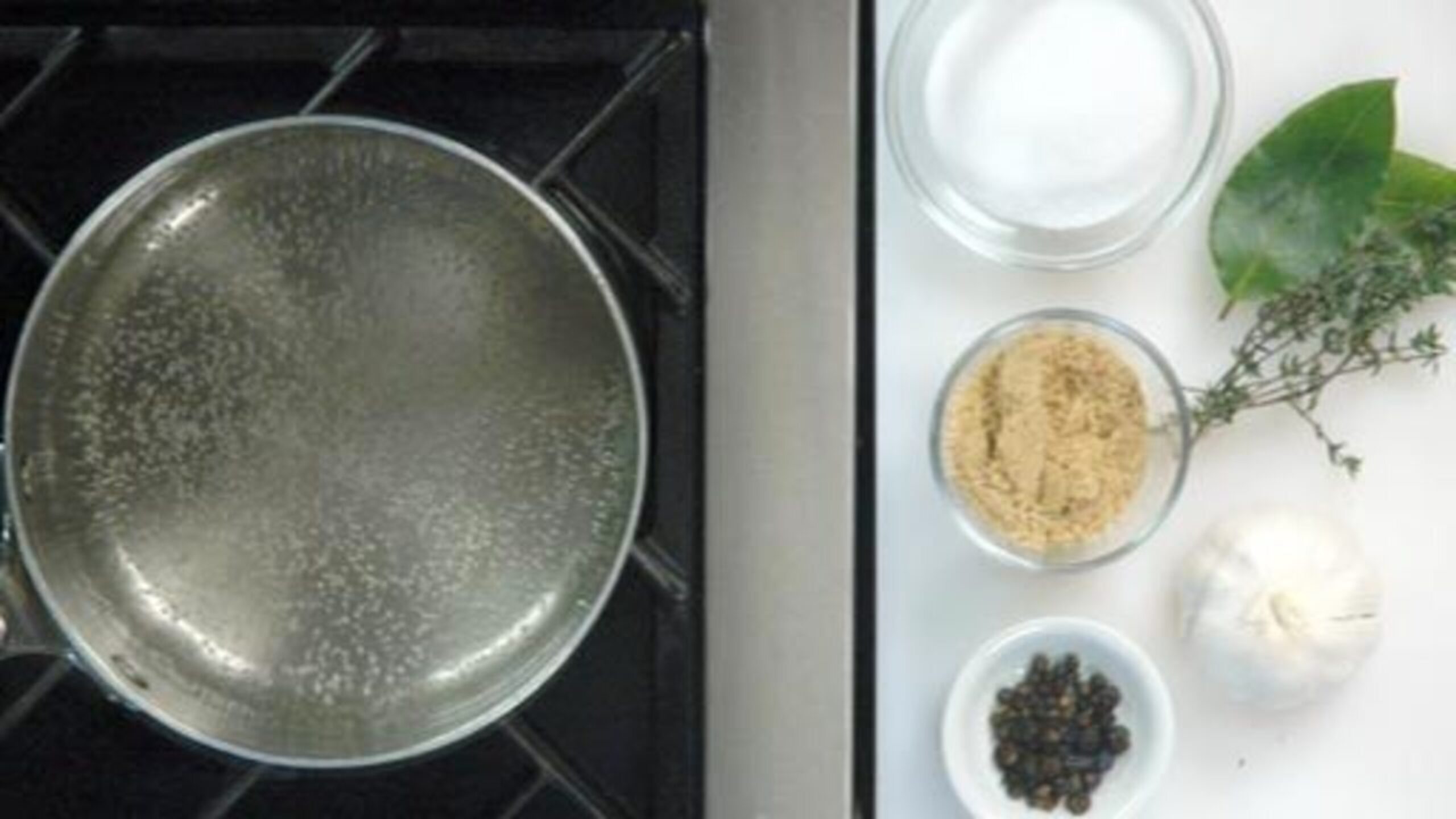To make the brine, place 4 cups of water into a pot and bring to a boil. Once boiling, add the salt, sugar, garlic, thyme, bay leaves and peppercorns and then turn the heat down to a simmer.