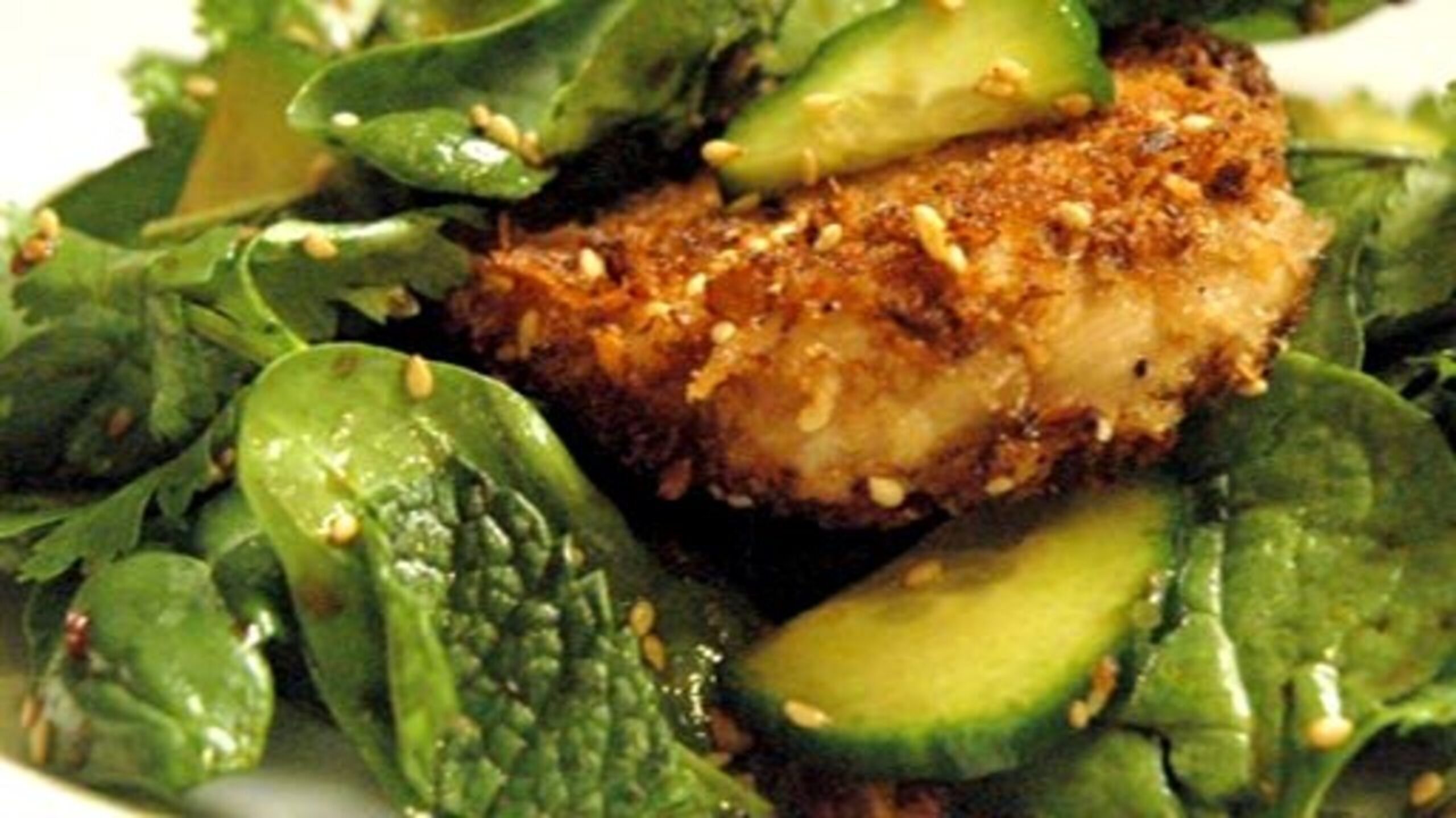 Add a few tablespoons of the vinaigrette (and the sesame seeds, if using) to the salad and gently toss to coat. Taste for seasoning, adding more vinaigrette and/or seasoning as needed.