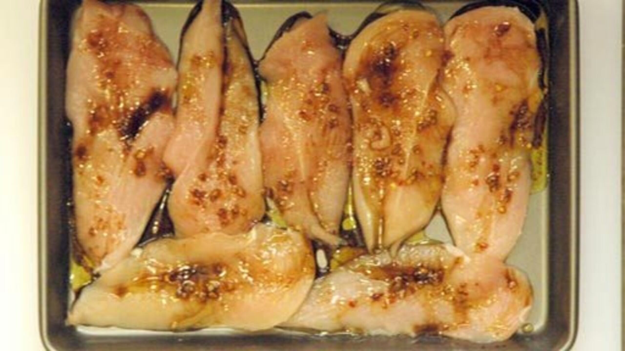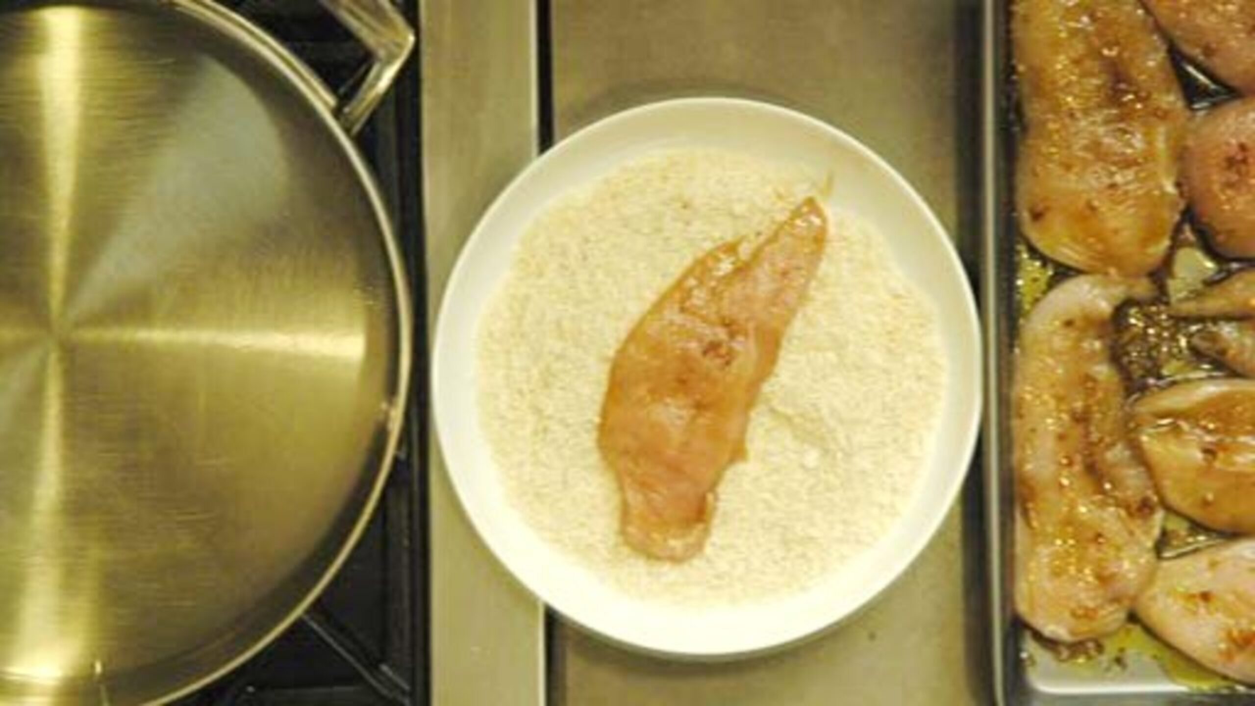 To prepare the chicken, slice it through the middle lengthwise. To do this, hold your knife horizontally to the cutting board and slice through the middle of the breast. Basically, you want 8 long, thin fillets.