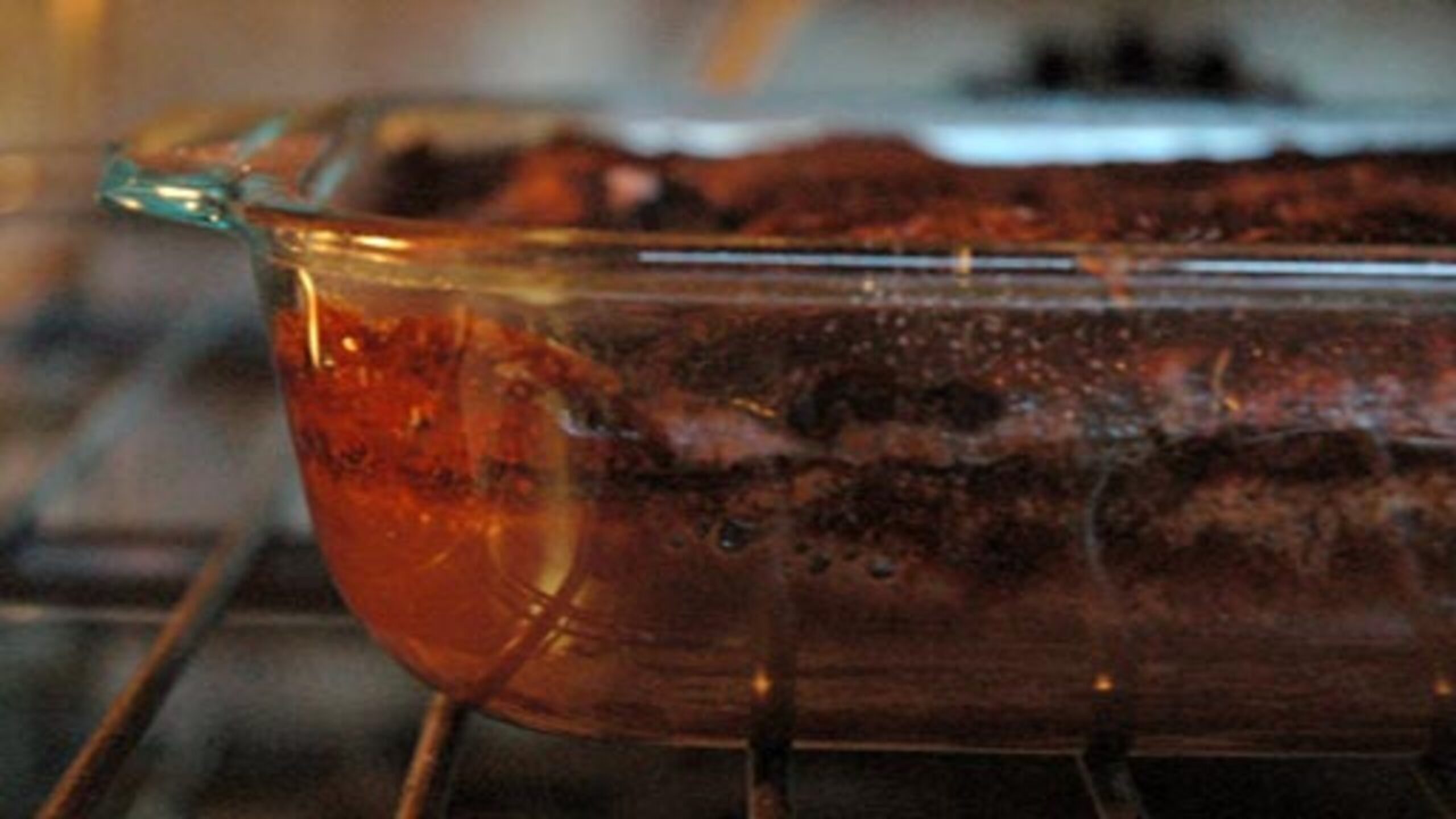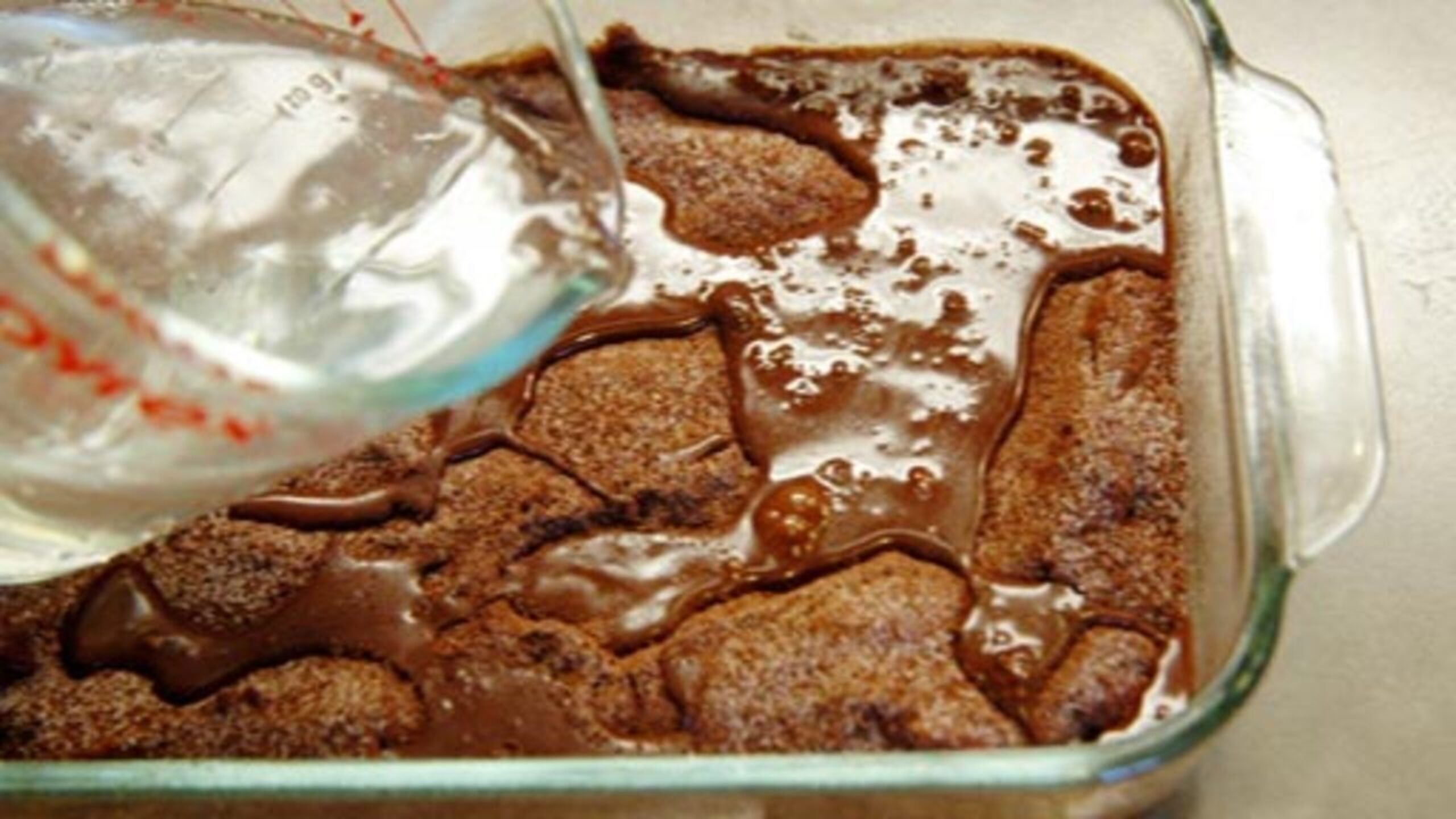 Carefully pour the warm water over the entire cake and topping mixture.