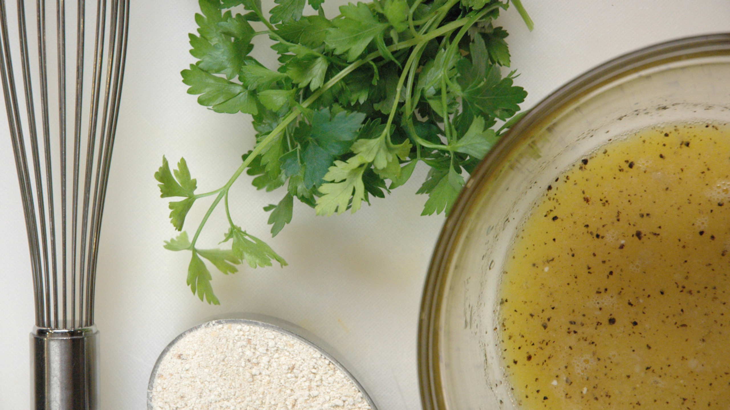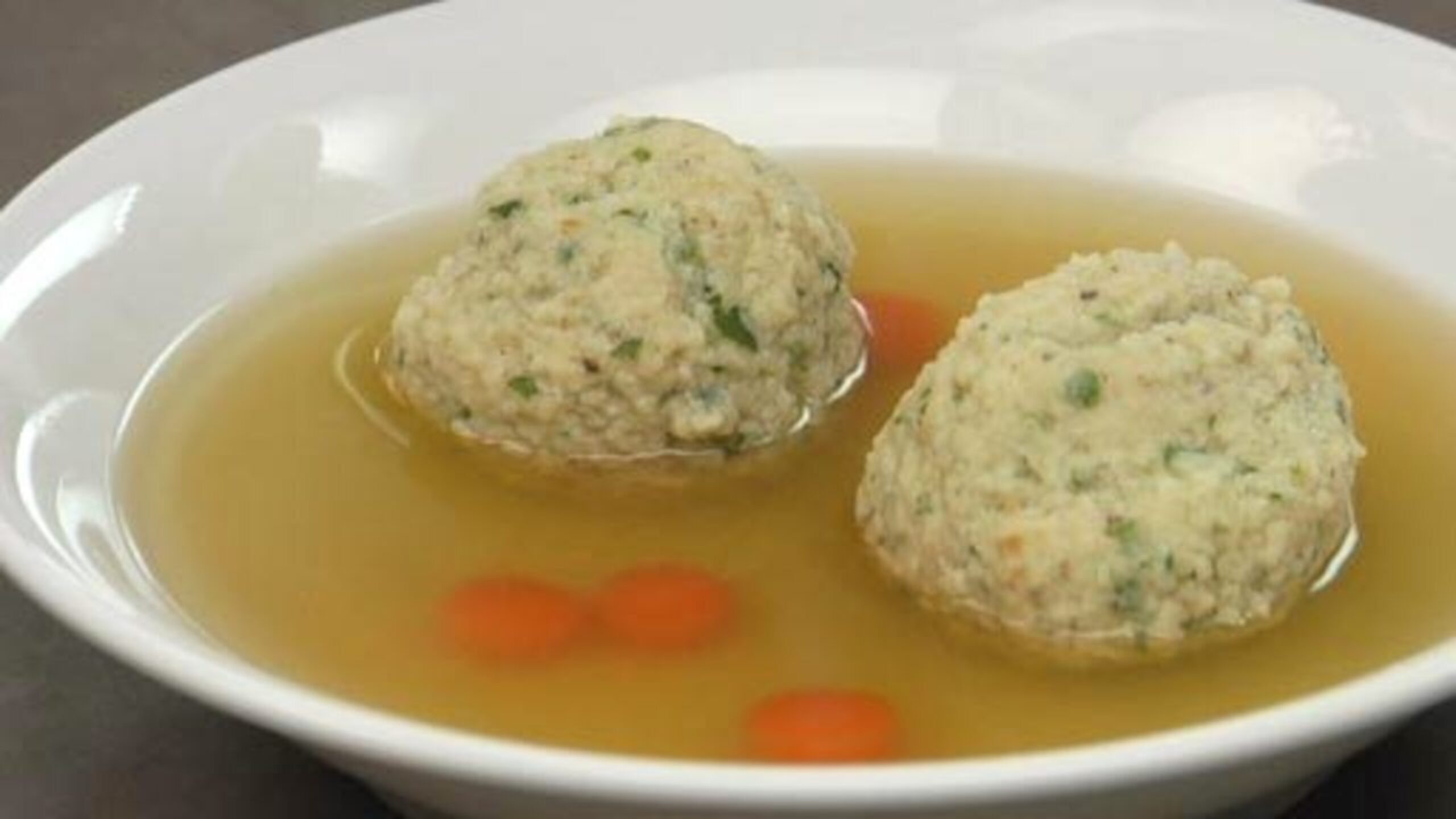 To start the matzo balls, first chop the parsley. Whisk together the egg yolks, parsley, chicken fat, salt, pepper and chicken broth. Stir in the matzo meal and set aside.
