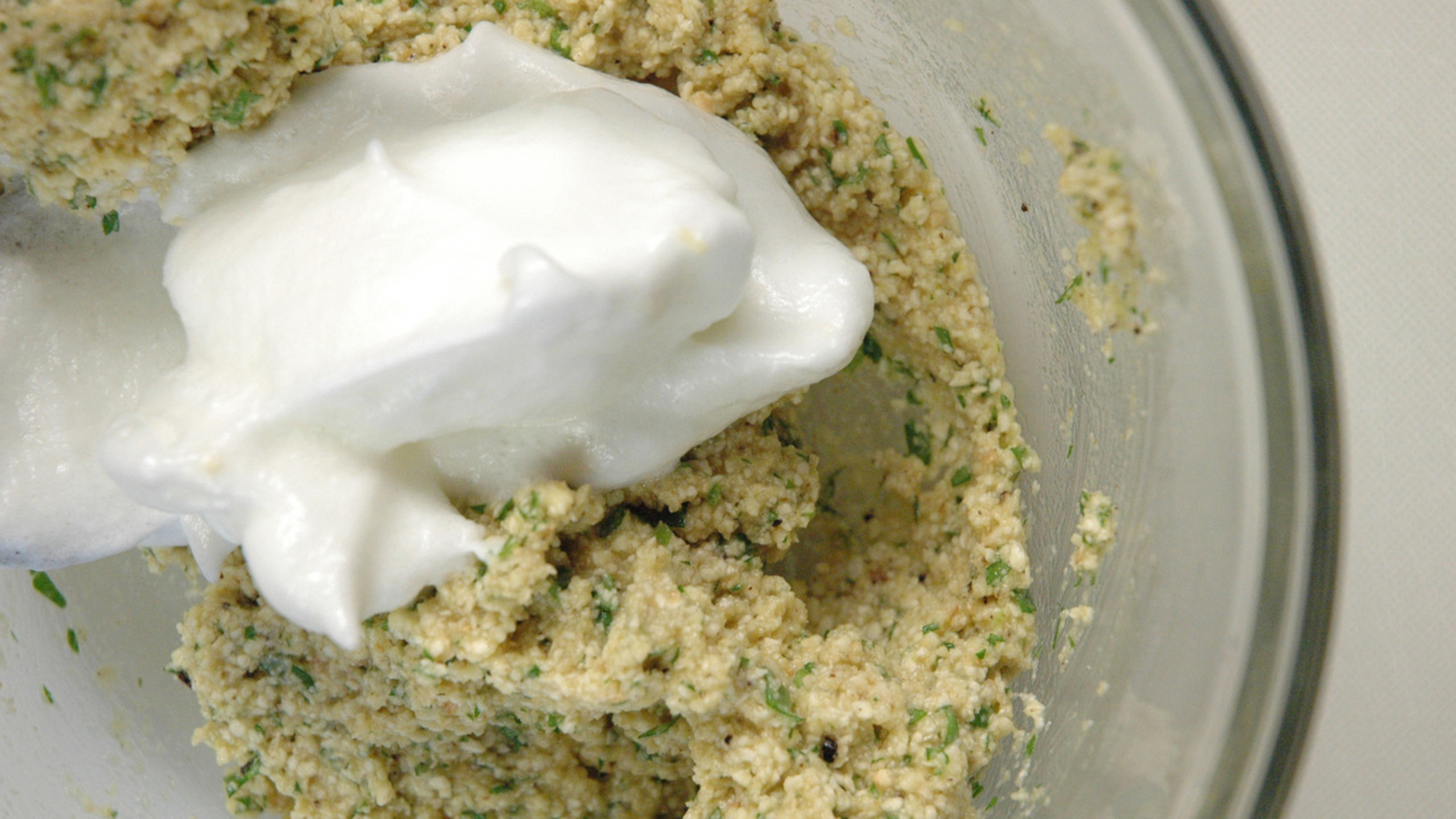 To finish the matzo balls, beat the egg whites on medium speed (or by hand) until stiff peaks form. Take about one-third of the egg whites and stir them into the matzo meal mix to loosen it up a bit. Then fold in the remaining egg whites.