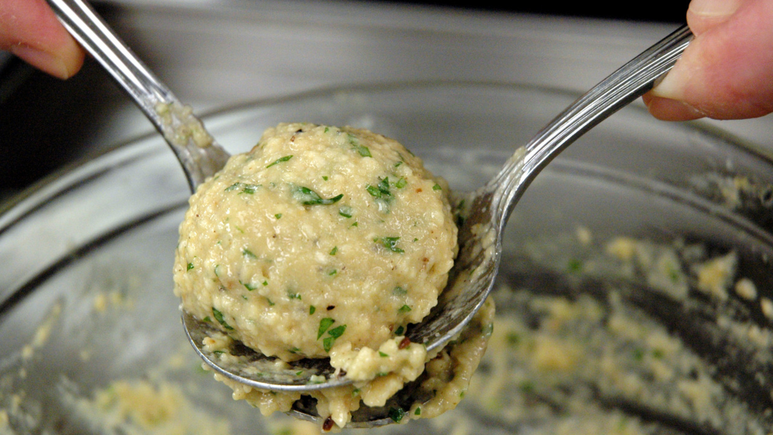 To roll the matzo balls, use 2 tablespoons to form the balls. Scoop from one spoon to the other until you form a ball. Then gently place the balls into the simmering liquid. Once all of the balls have been added, cover and let simmer for about 15 minutes. When done, they should just be slightly firm. In the meantime, move ahead to the next step.
