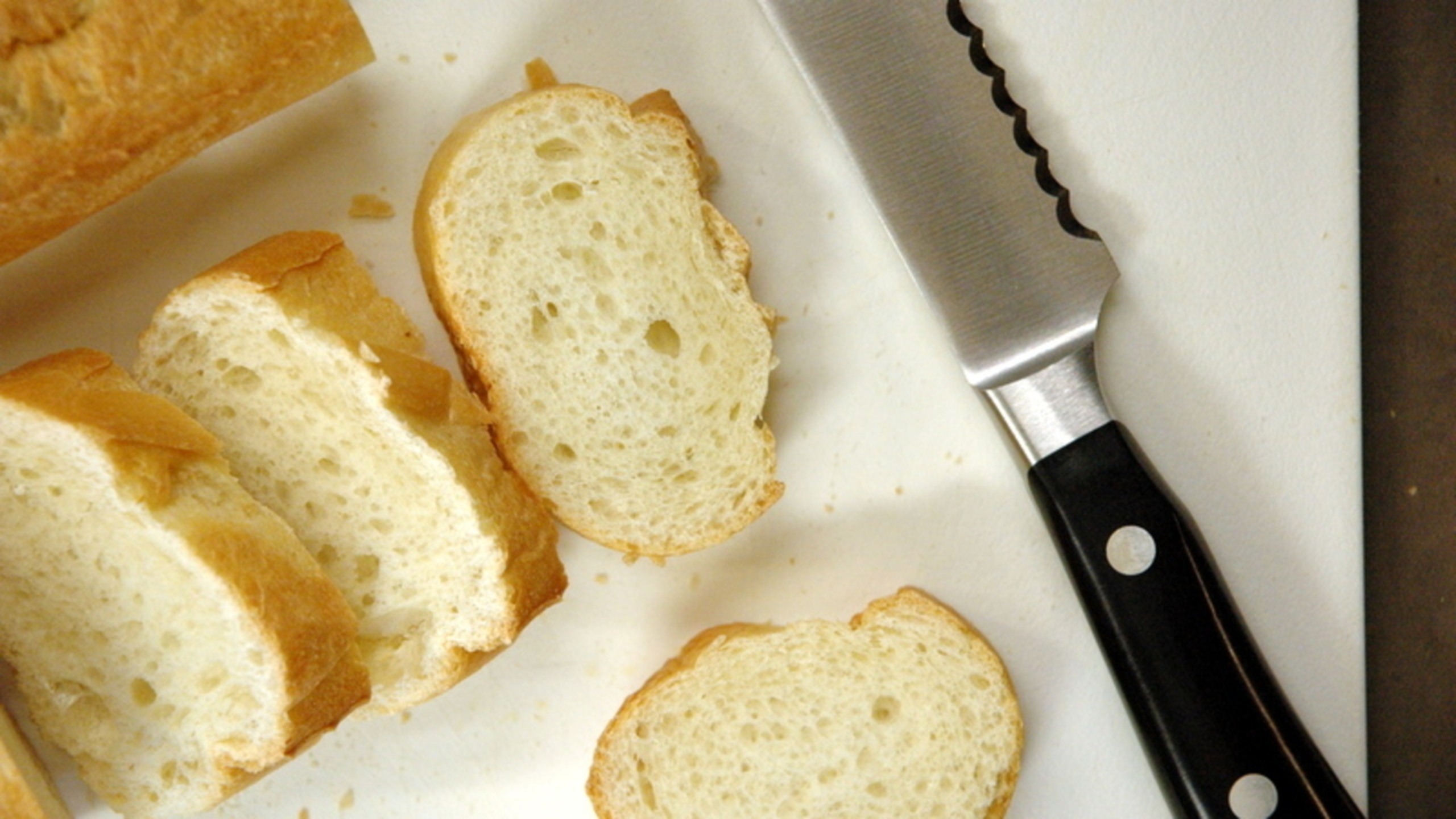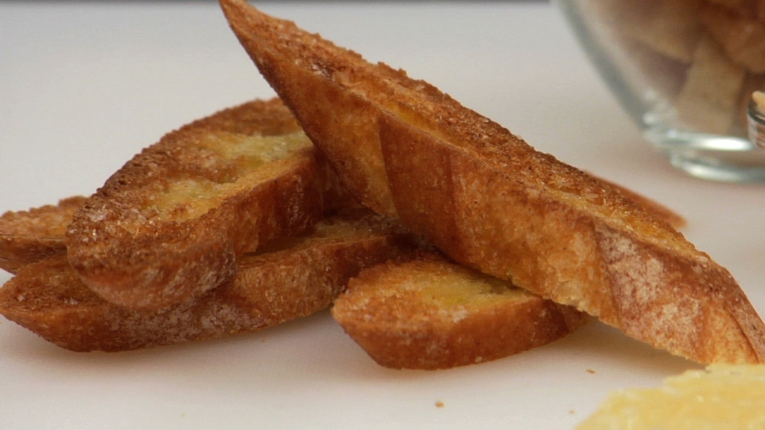 To start the crostini, preheat the oven to 375° Fahrenheit. Cut the baguette into 1/2-inch slices and place the pieces onto a parchment-lined baking tray. Brush lightly with olive oil. Bake, oil-side up, for 8 to 10 minutes or until slightly golden.