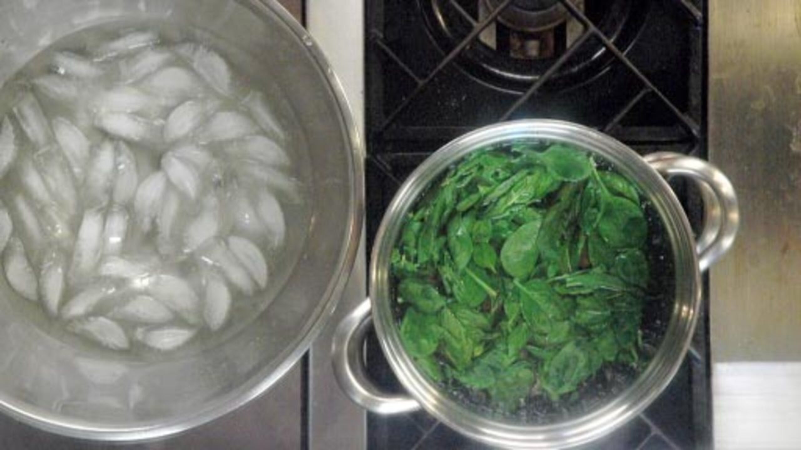 Bring a large pot of cold water to a boil and blanch the basil for about 10 seconds to set the color. Remove and immediately place into an ice bath to stop the cooking process.