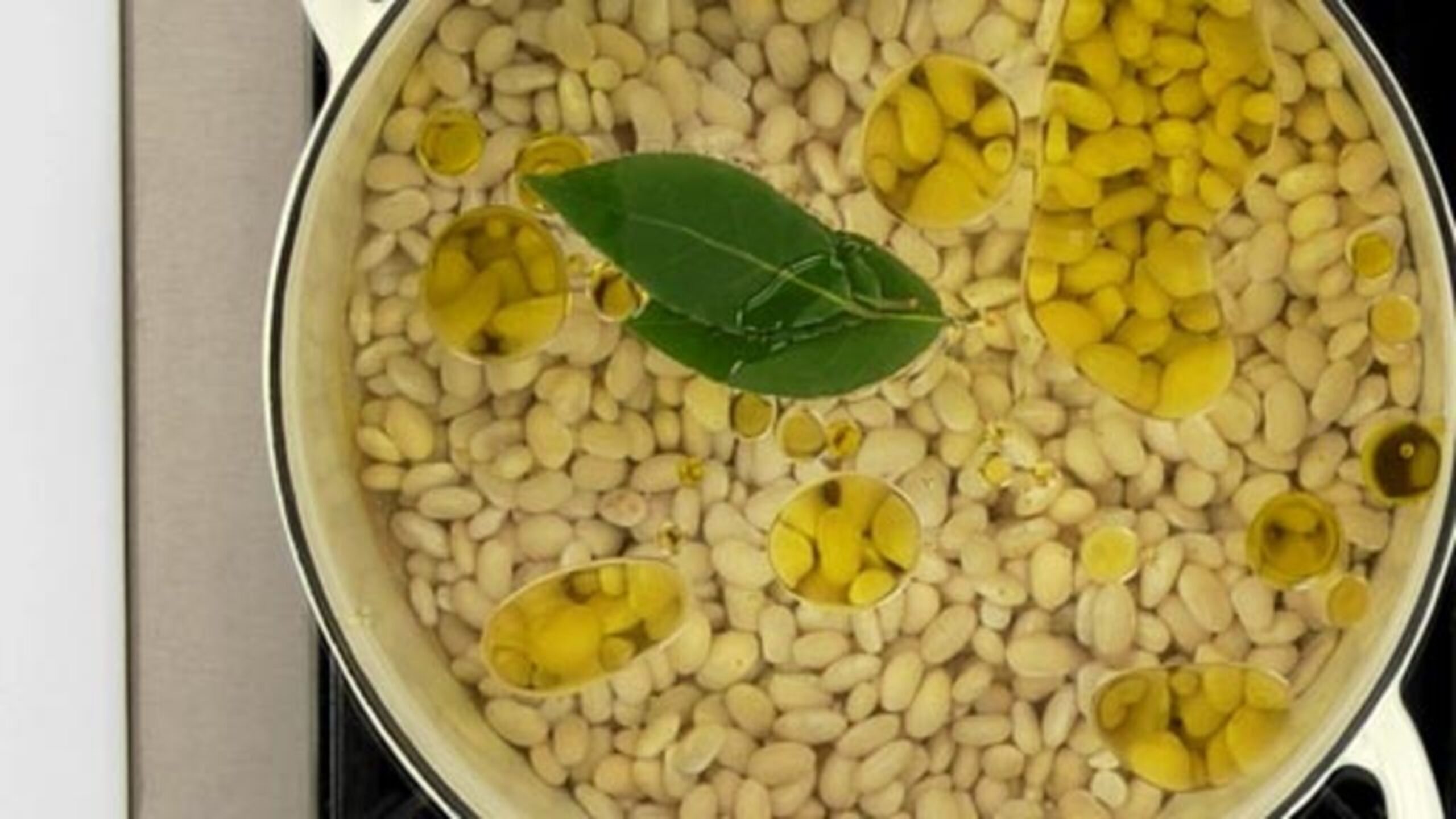 Drain the beans and then place into a pot, along with the garlic cloves and bay leaves. Add about twice the amount of water to beans and bring to a boil.