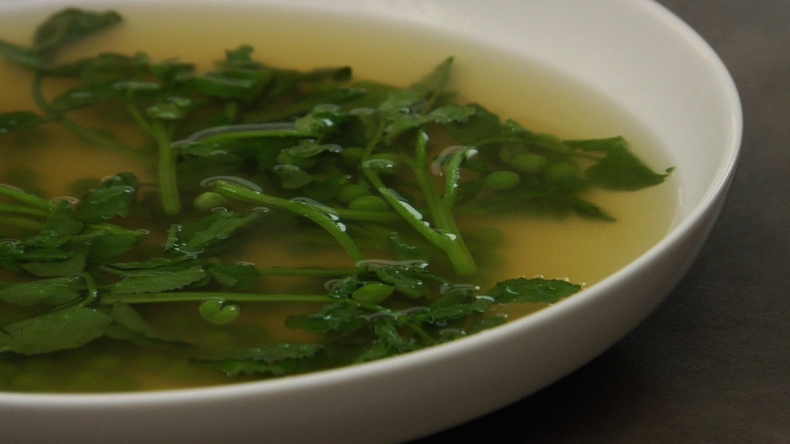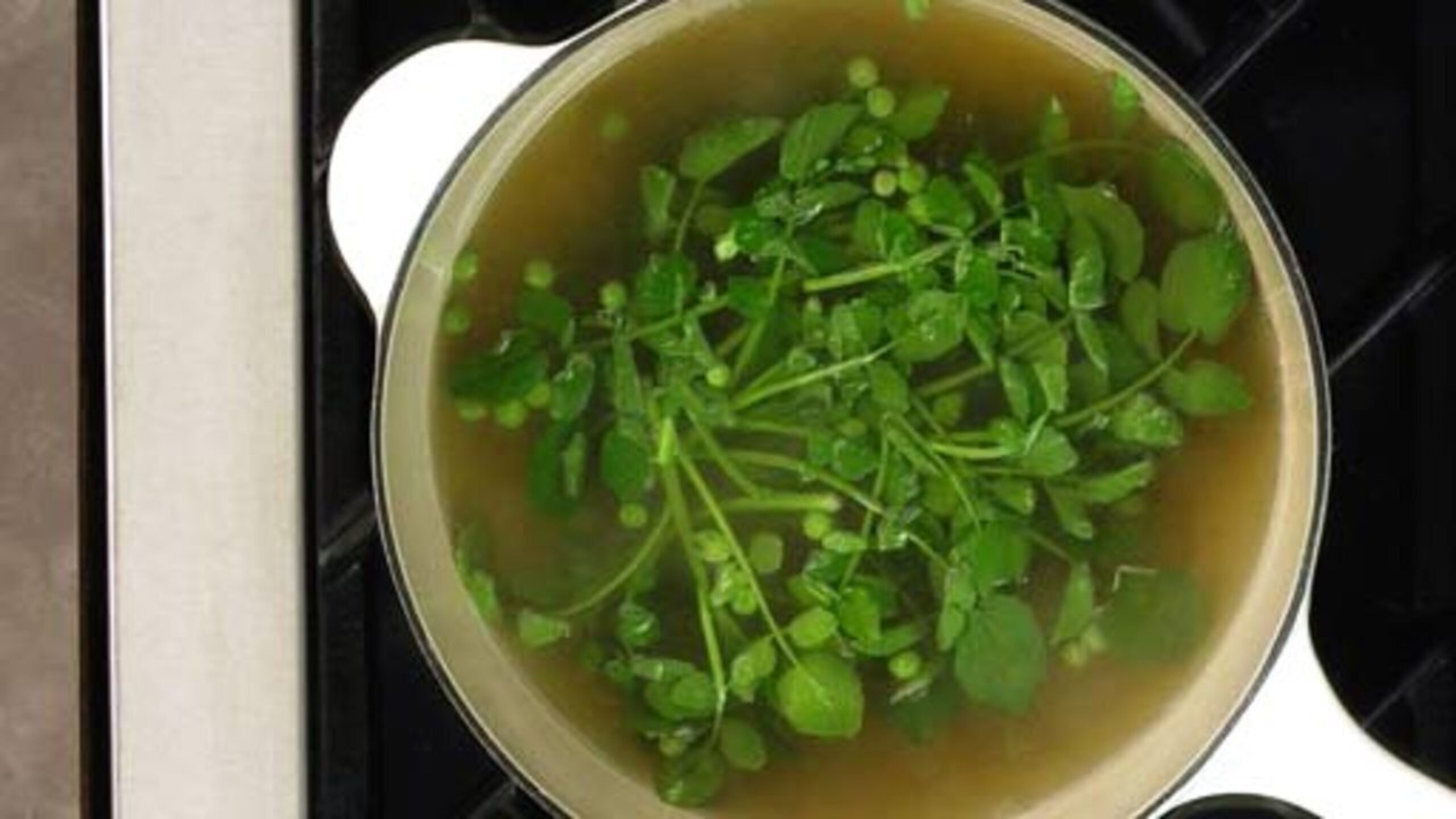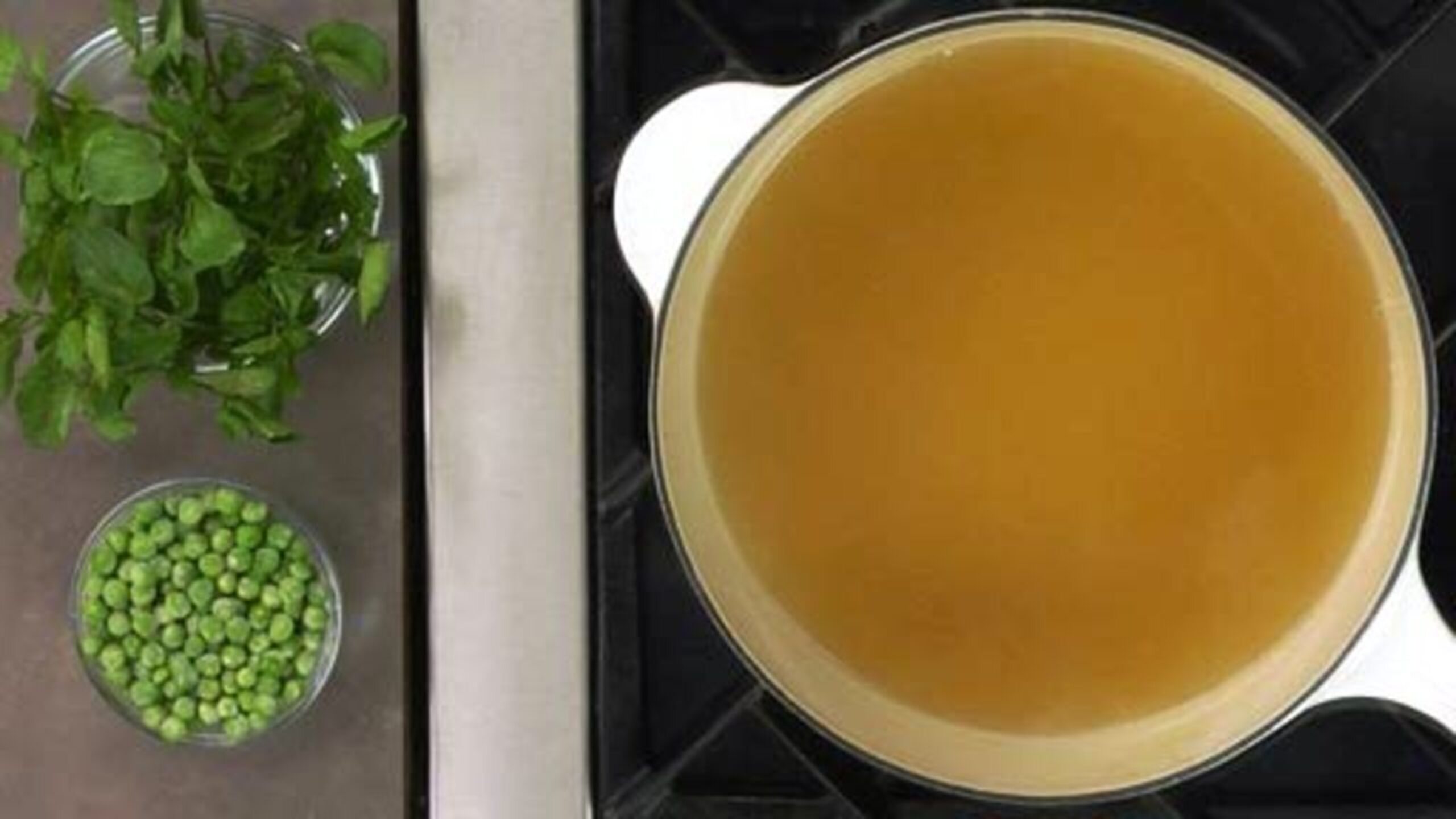 To prepare the soup, add the peas to the broth and simmer until just tender, about 3 minutes or so.