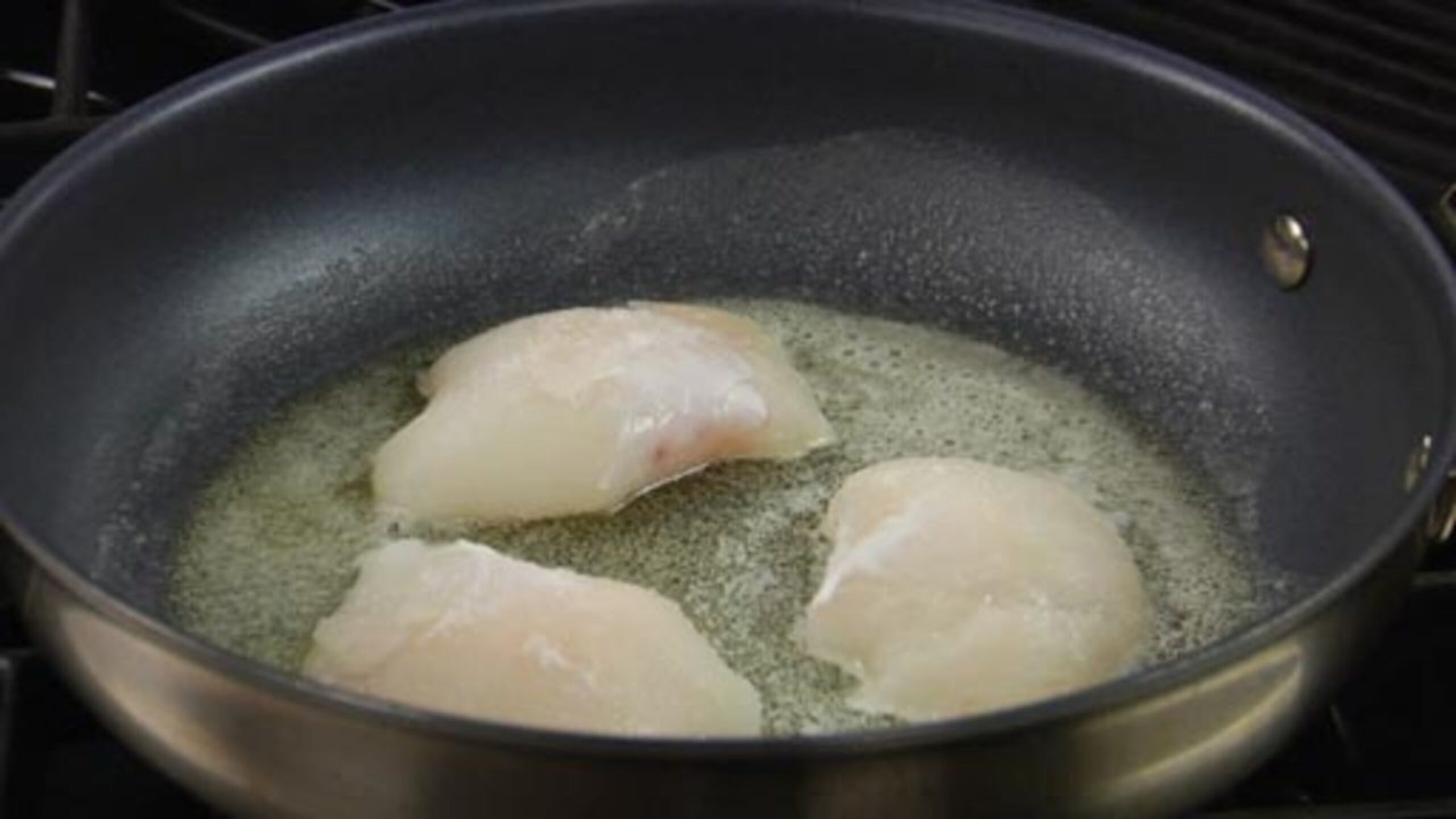 Pat the fish dry and season both sides with salt and white pepper. Place the fish, presentation-side down into the pan and gently pan fry until the edges become opaque.