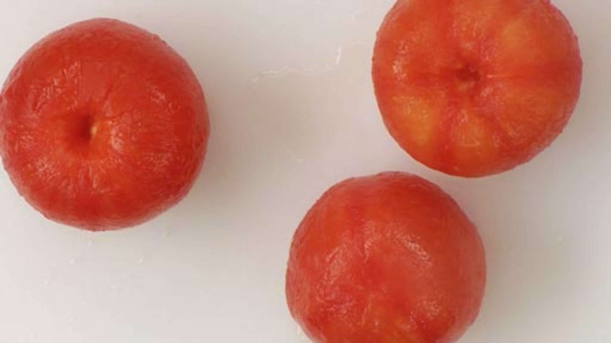 To prepare the tomato concassé, first blanch the tomato to remove the skin. Cut the tomato into 4 quarters and remove the pulp and seeds. Gently flatten the tomato and carefully with your knife, trim the pulpy edge so it is one even piece. Next, dice the tomato into even-sized cubes. Set the concassé aside.
