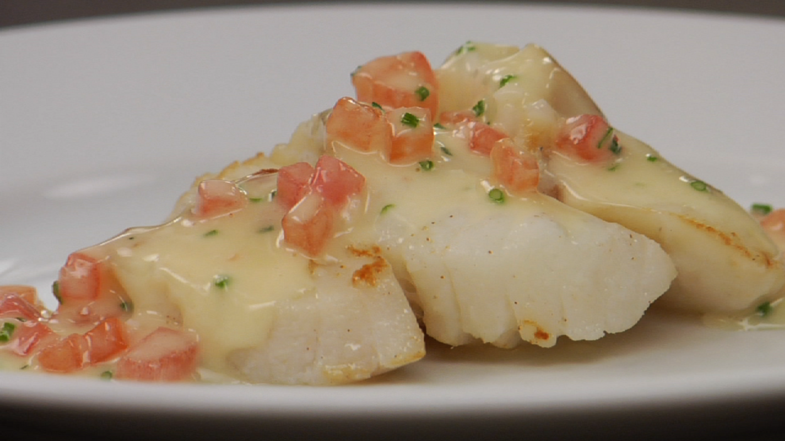 Just before serving, gently stir the tomato concassé and chives into the sauce. Pour over fish, chicken or seafood and enjoy.