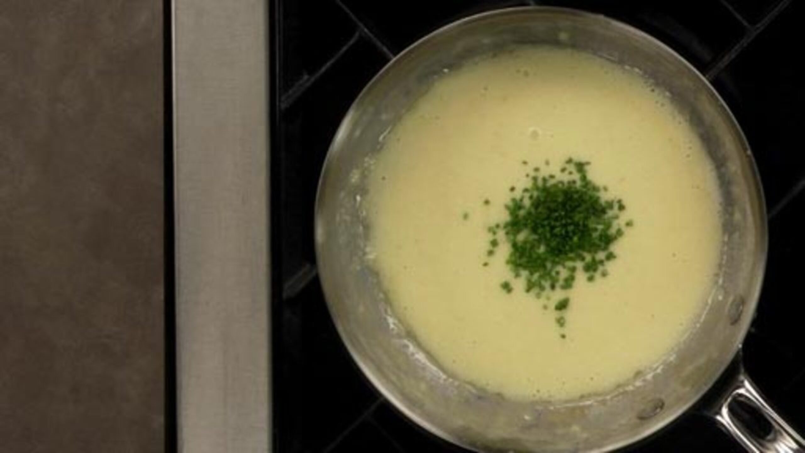 To finish the sauce, finely chop the chives. Whisk in a few drops of truffle oil to taste. Be careful as it can be quite overpowering – a little goes a long way. Finely slice the chives and whisk into the sauce.