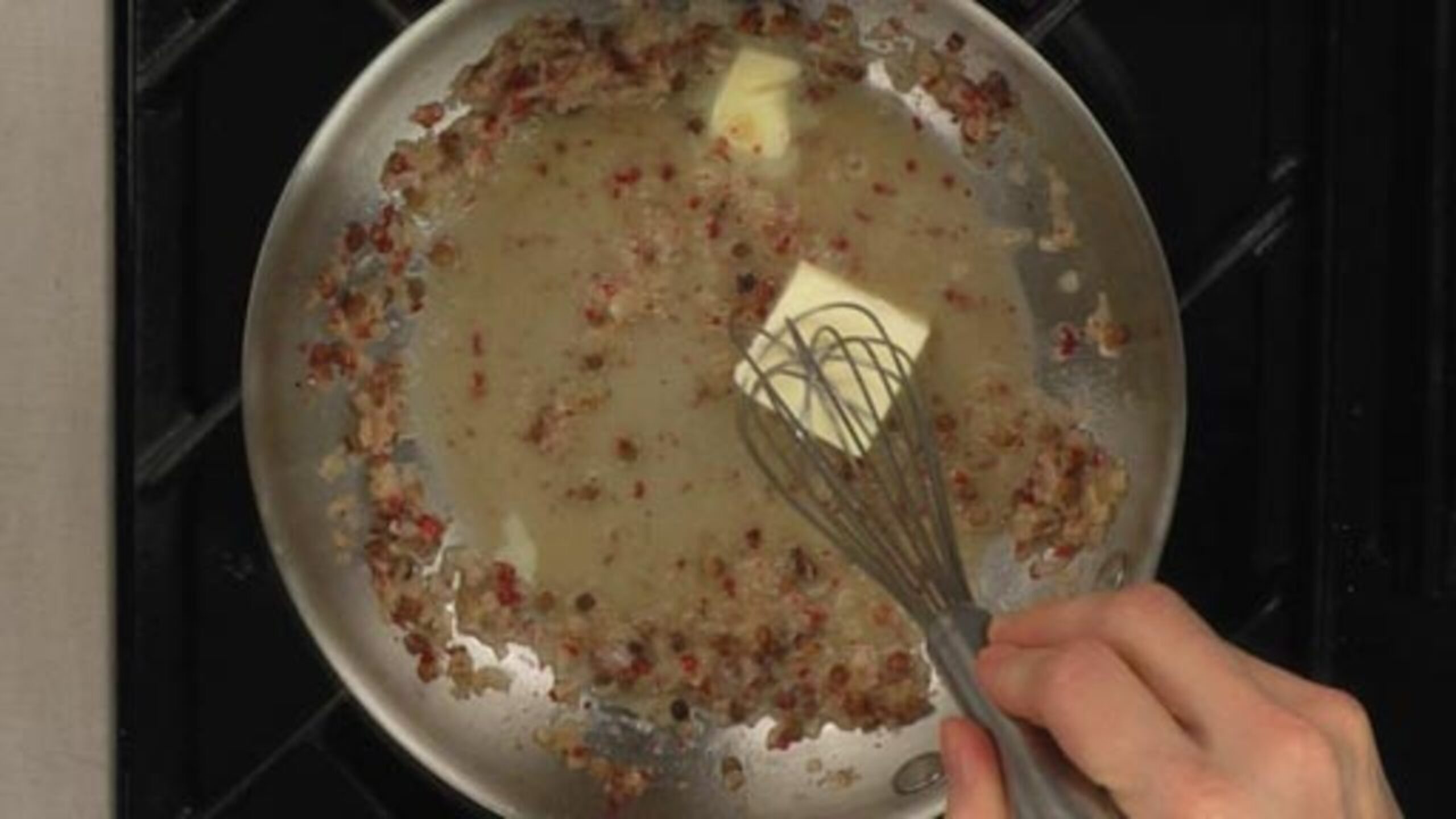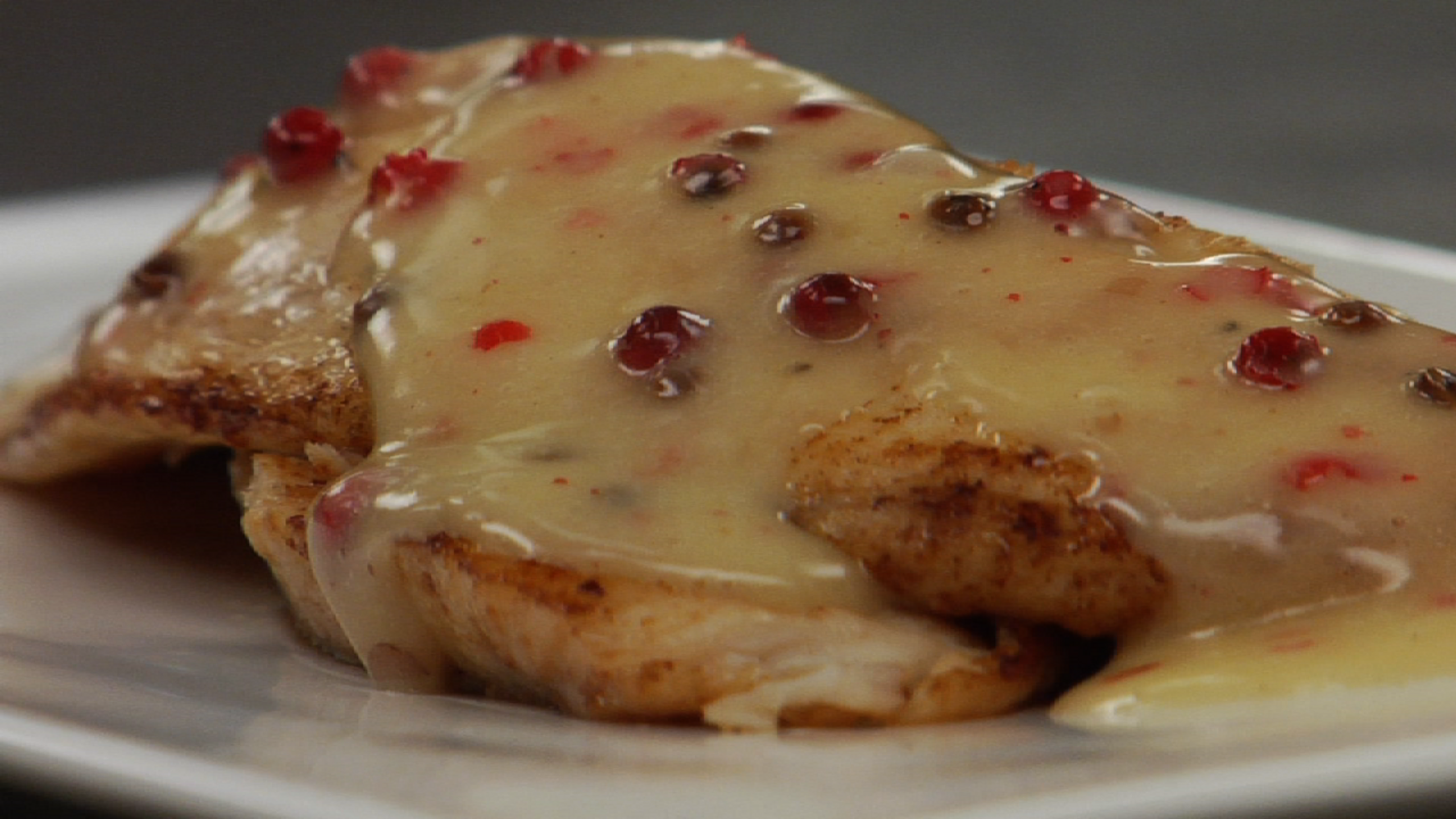 Before serving the sauce, strain it to remove the crushed peppercorns. For nice presentation, whisk in whole pink peppercorns.