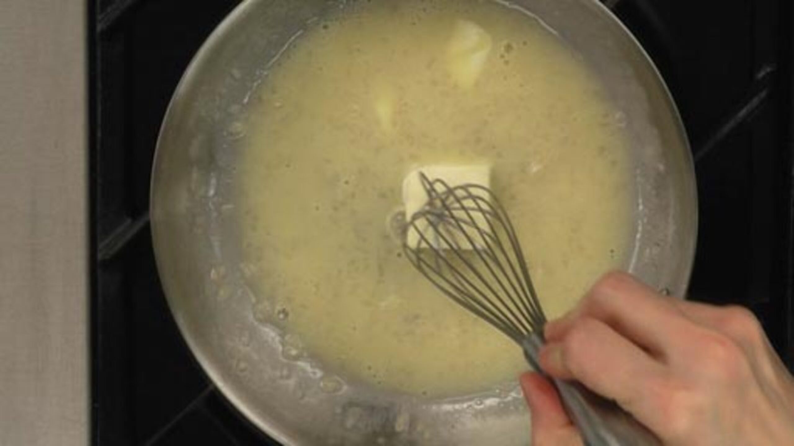 Turn the heat to the lowest setting and whisk in the cold butter one piece at a time to slowly form the emulsion.