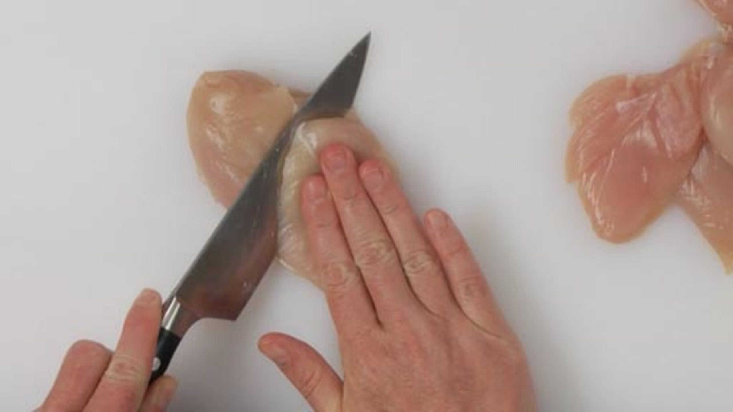 To prepare the chicken, slice each breast on a bias into 3 equal pieces. Cover with plastic wrap and gently pound each piece to flatten slightly. Season each side with salt and pepper to taste.