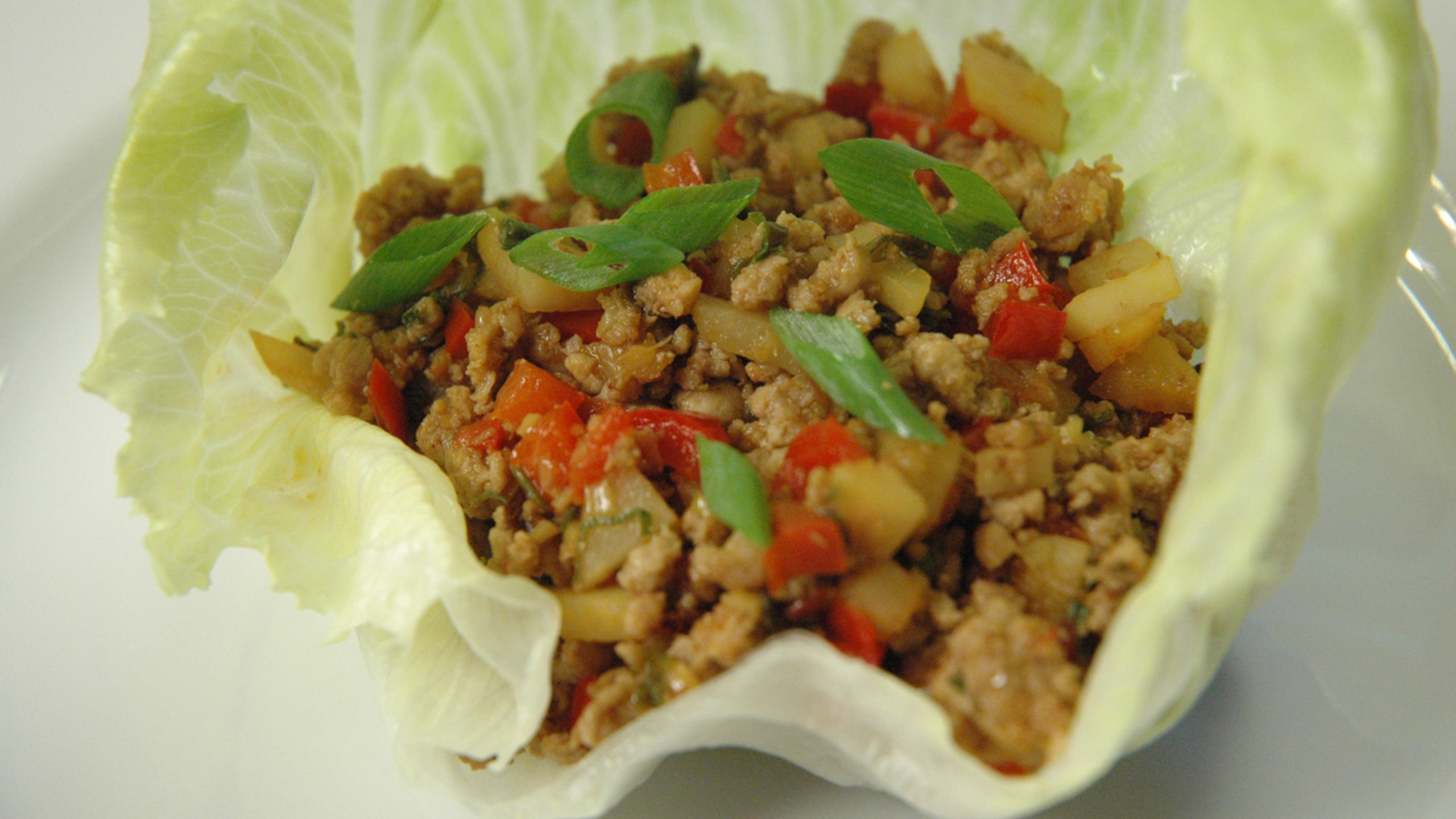 To serve the lettuce wraps, scoop a bit of the pork mixture into a lettuce cup. Slice the green onion on the bias and sprinkle over top, if desired. Serve with additional sambal, if desired.