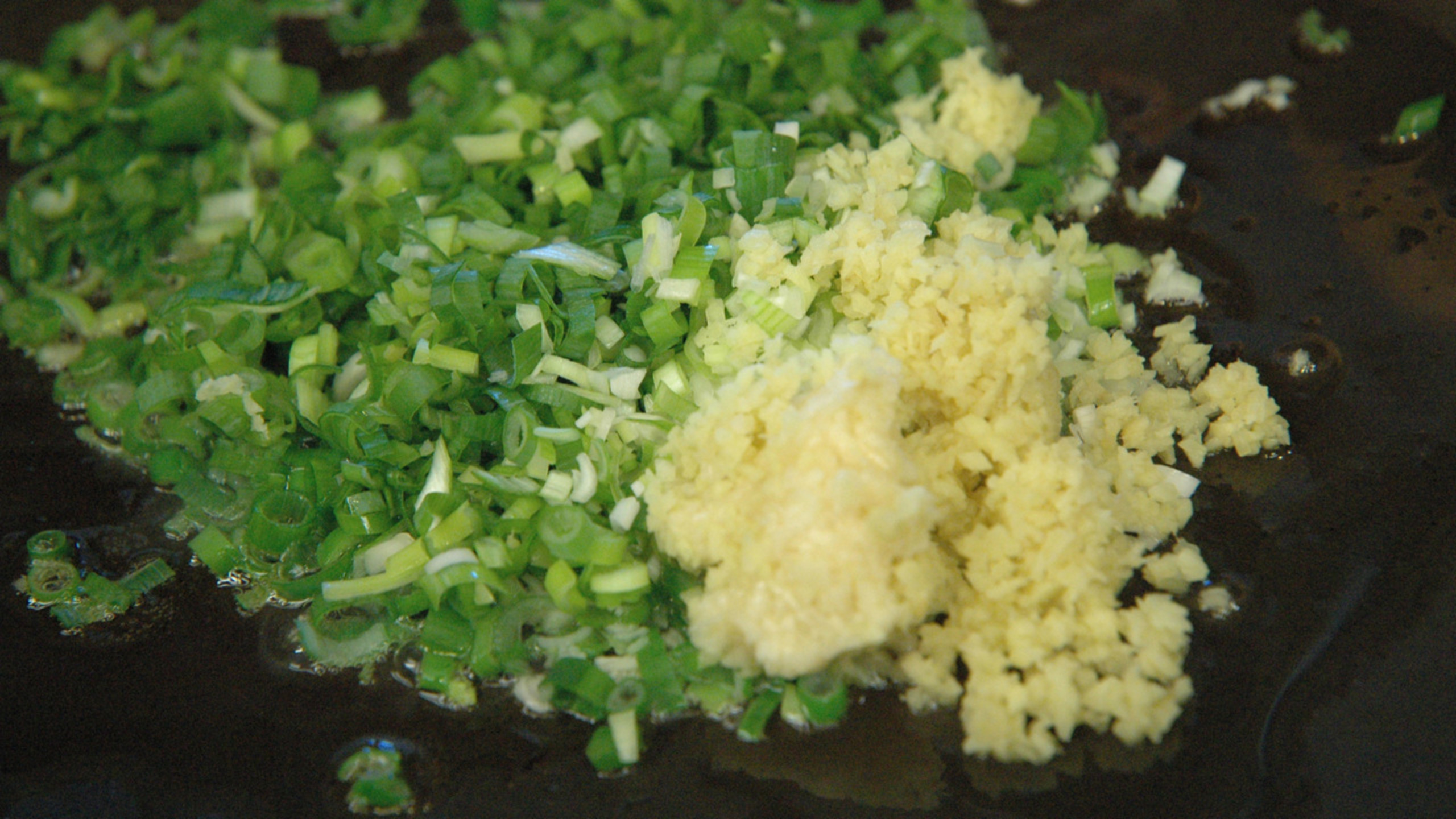 To start the dish, heat a large, non-stick fry pan over medium heat. Add the oils, followed by the ginger, garlic and green onions. Stir and cook the aromatics for a couple of minutes, taking care not to burn the garlic.