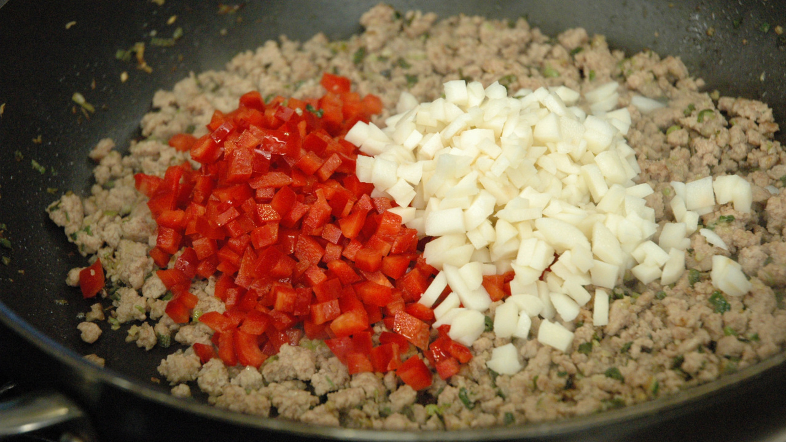 Once the pork is lightly browned, add the red pepper and water chestnuts. Let cook for a minute or two.