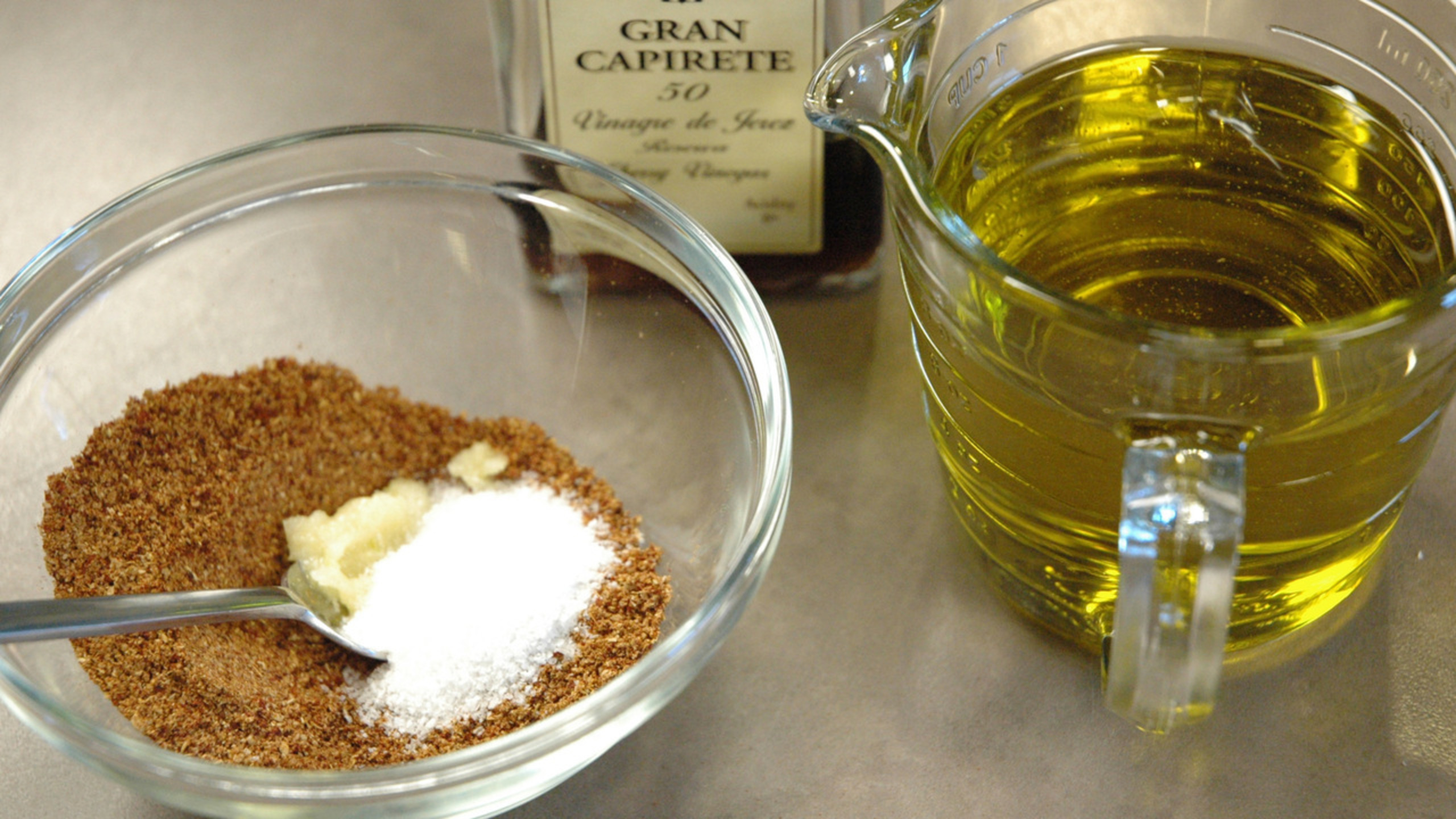 Crush the garlic into a paste and add it to the spice mix, along with the cayenne and salt. Next, add the sherry vinegar and olive oil and mix to combine. Taste for seasoning, adding more vinegar or salt if needed.
