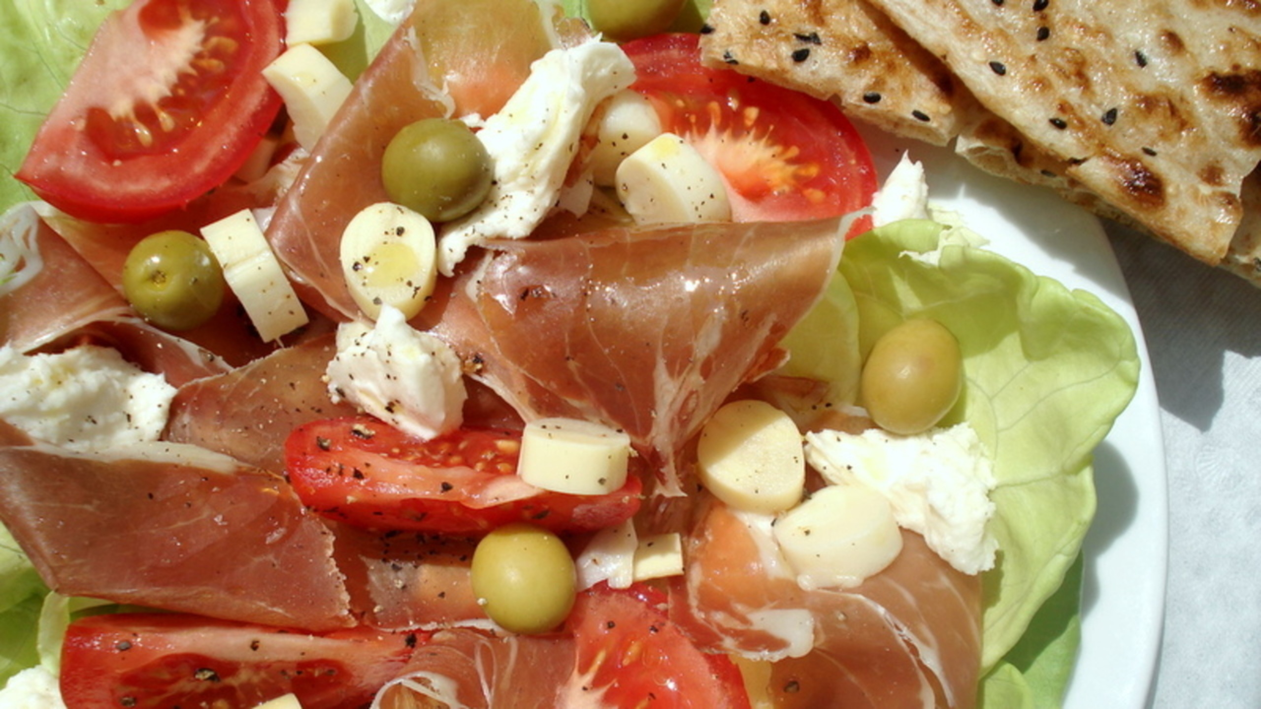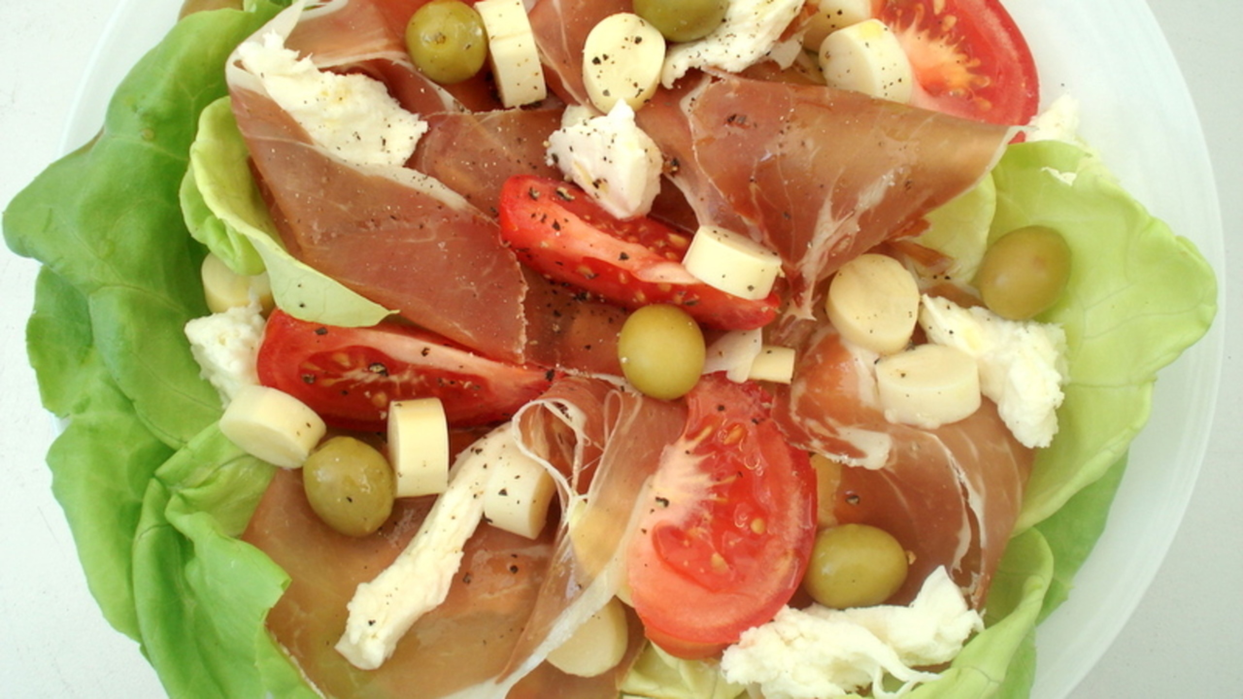 Lay the Serrano ham over top, followed by the tomatoes, heart of palm and fresh mozzarella cheese. Drizzle with a bit more red wine vinegar and extra-virgin olive oil. Season again if necessary.