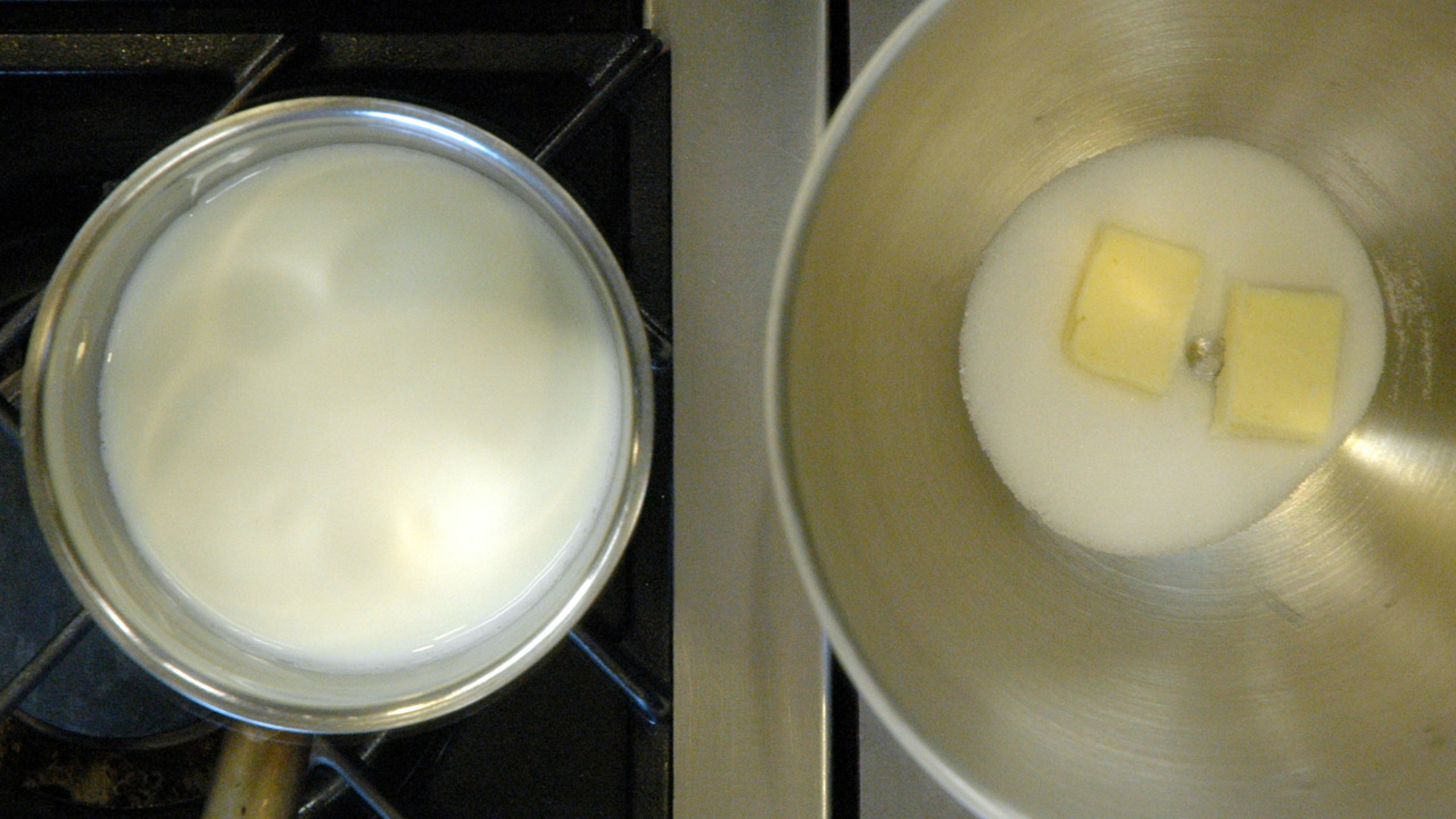 Bring the milk just to a boil and pour over top the sugar and butter. Stir and let stand to melt.