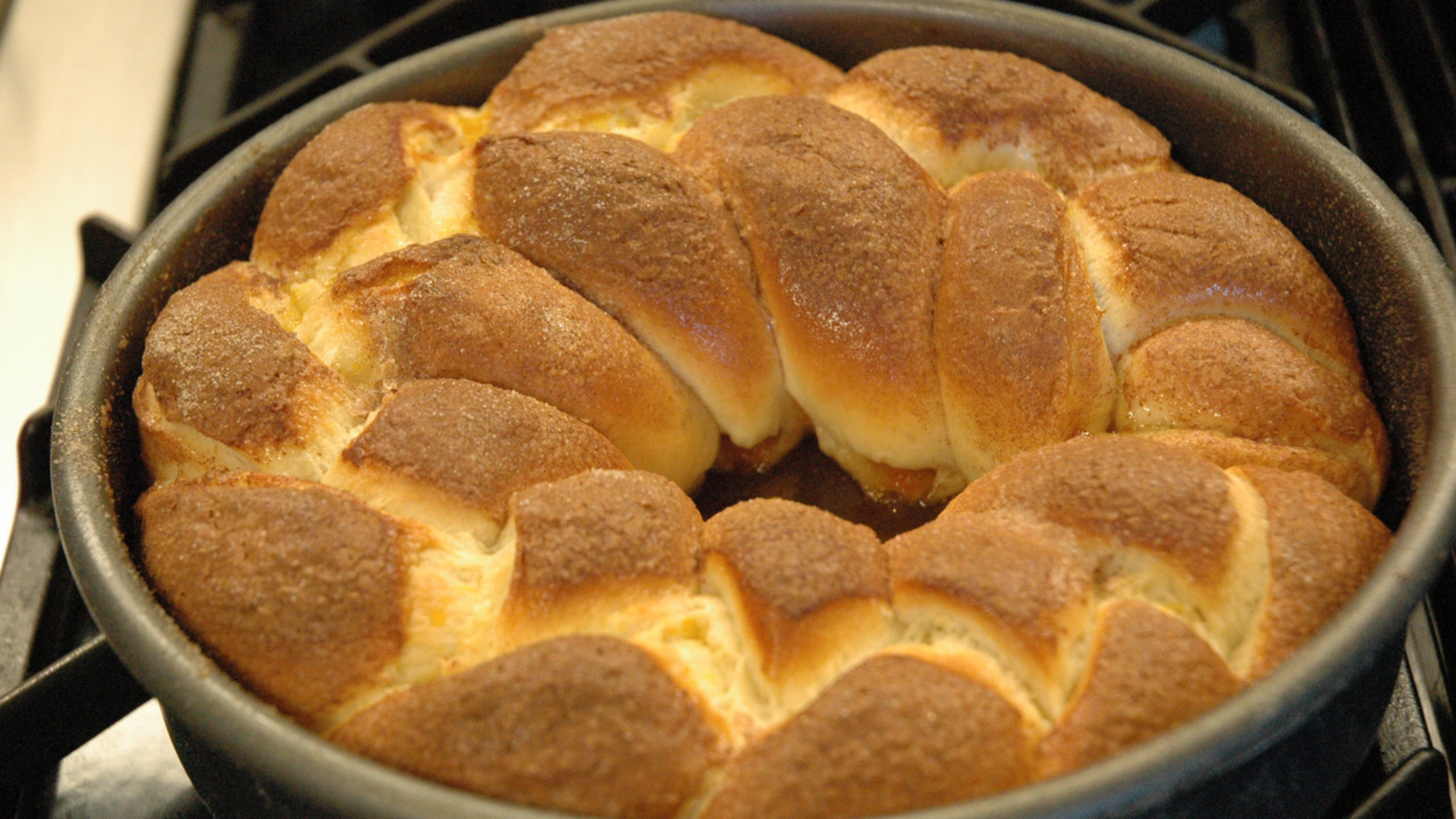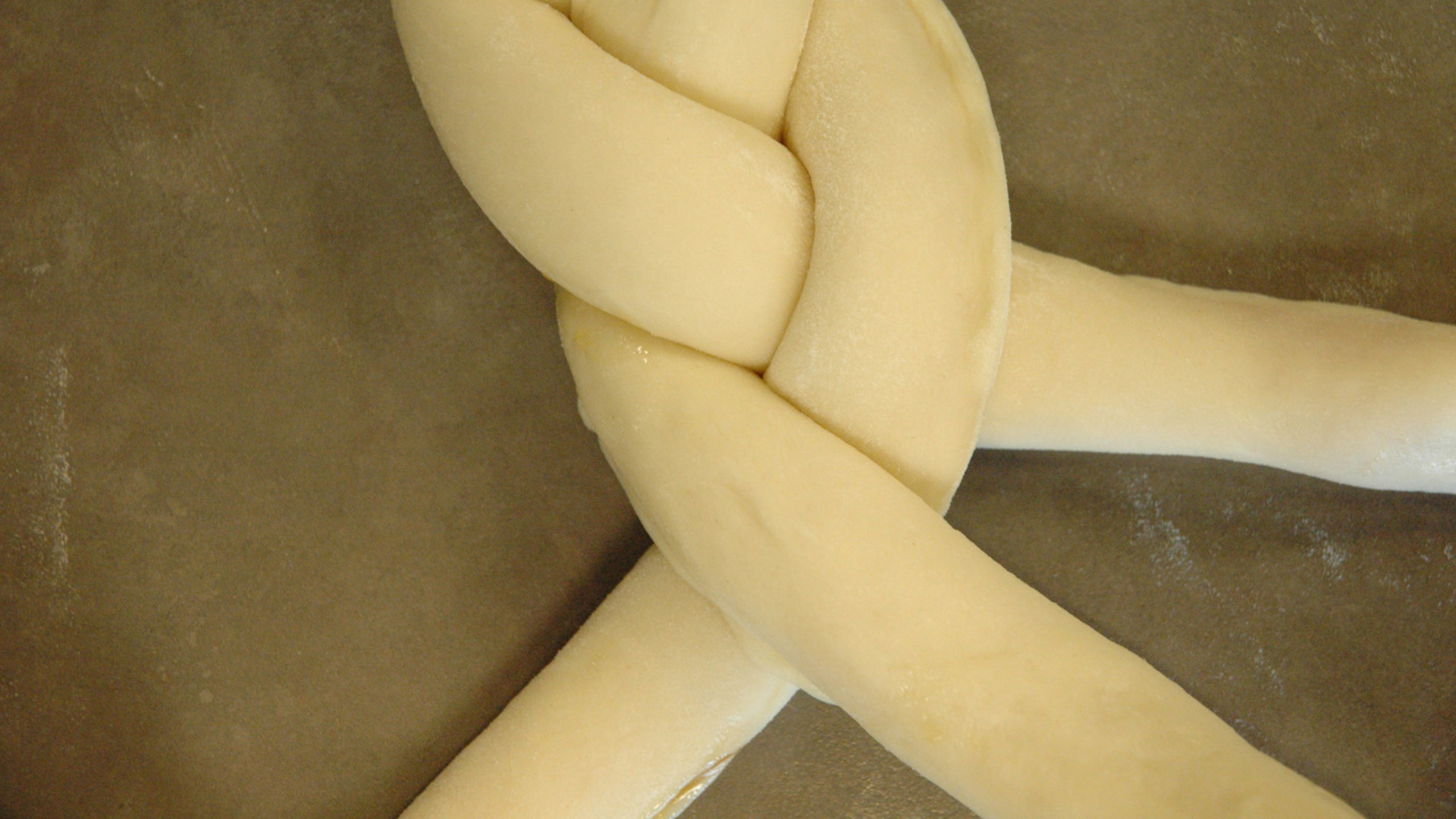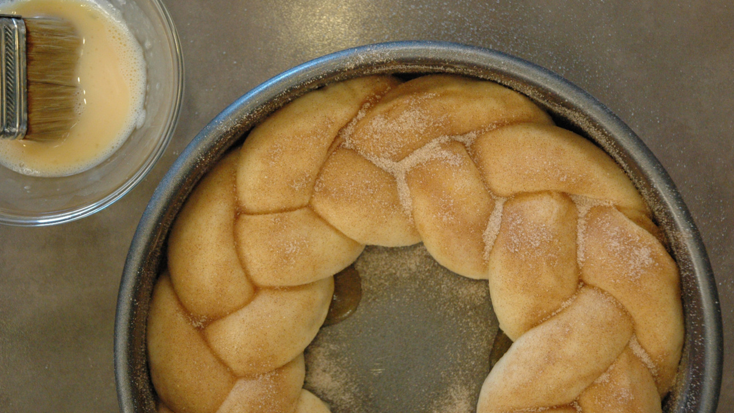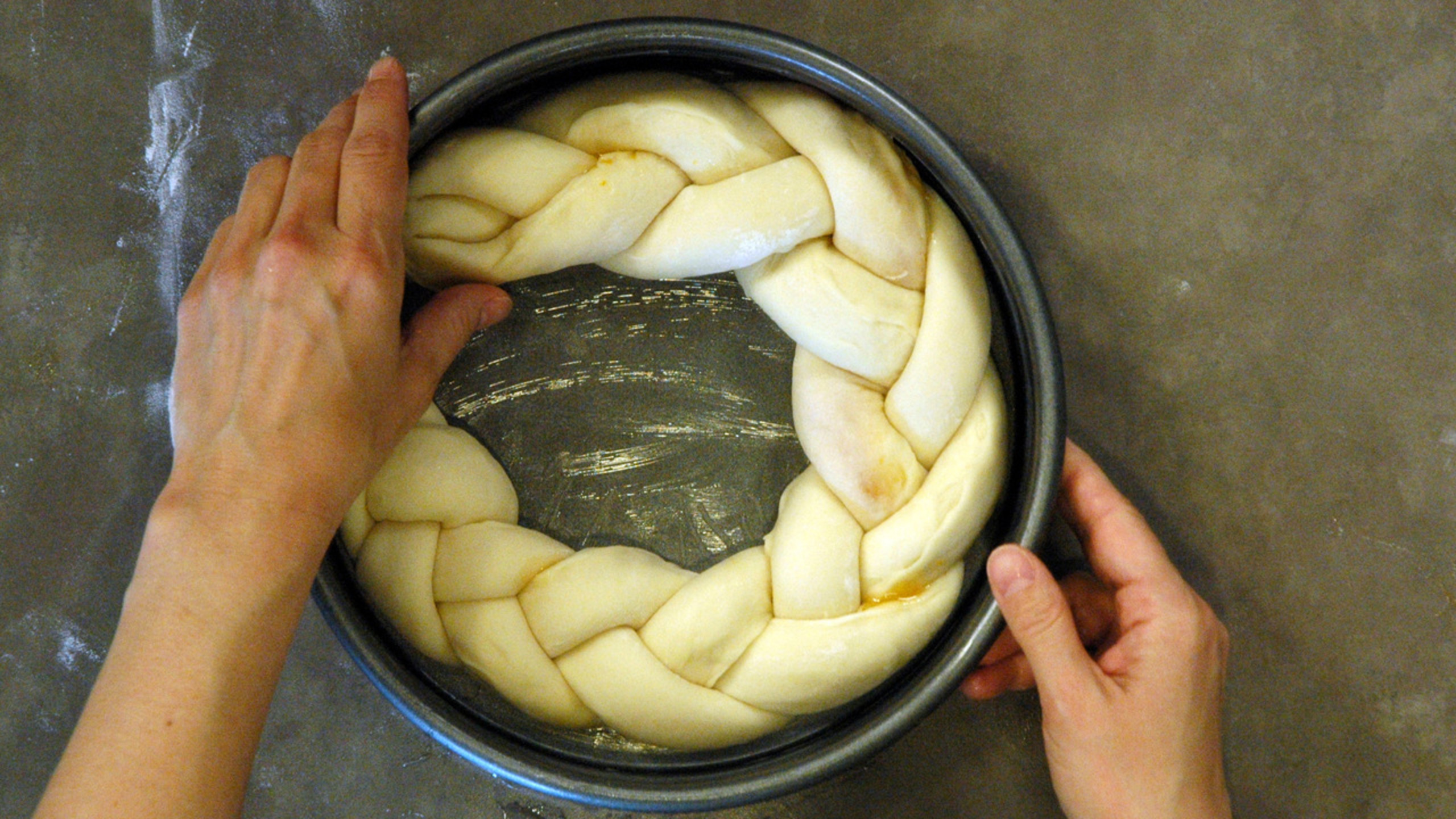 Place the braided dough into the pan, forming it into a horseshoe or circle.