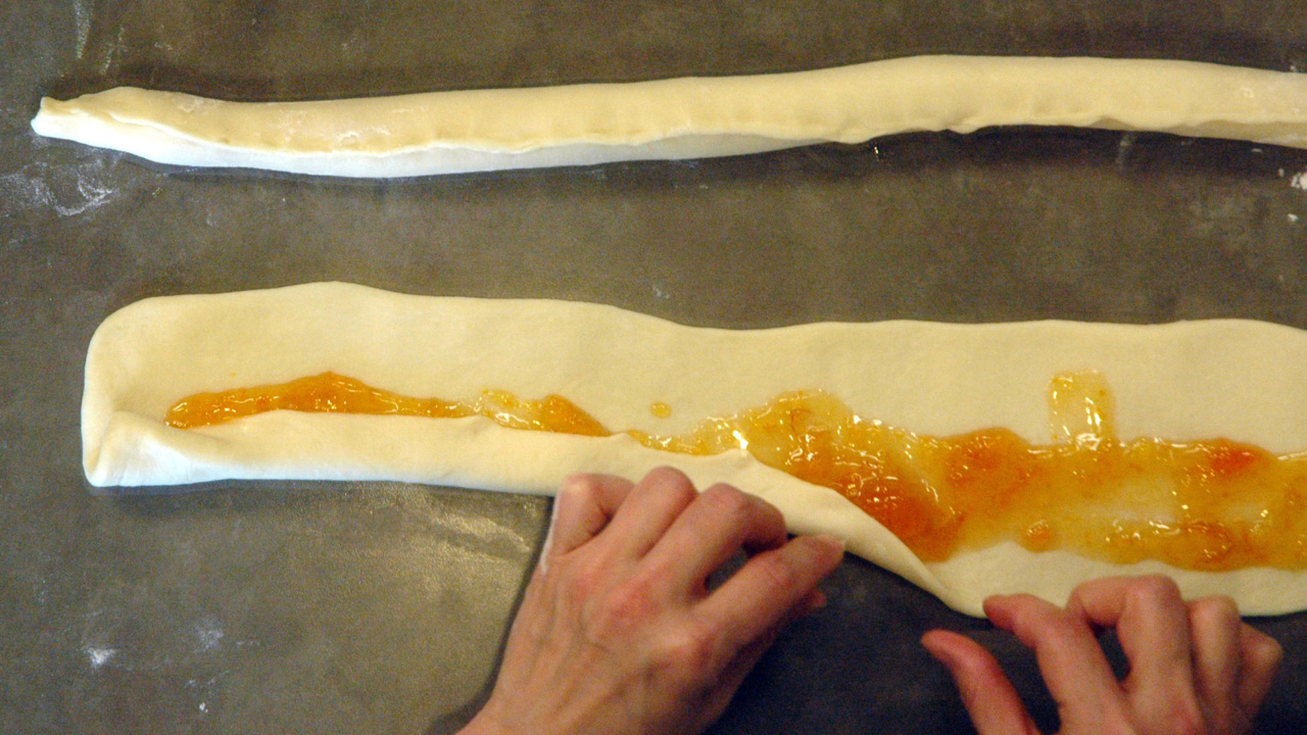 On a lightly-floured surface, roll each piece out into a rectangle about 4″ × 20″ -inches long (10 cm x 50 cm). Spread a thin layer of jam over the middle and roll into a jelly roll. Make sure to pinch the seams and ends together to make a tight seal (otherwise the jam will run out during baking).