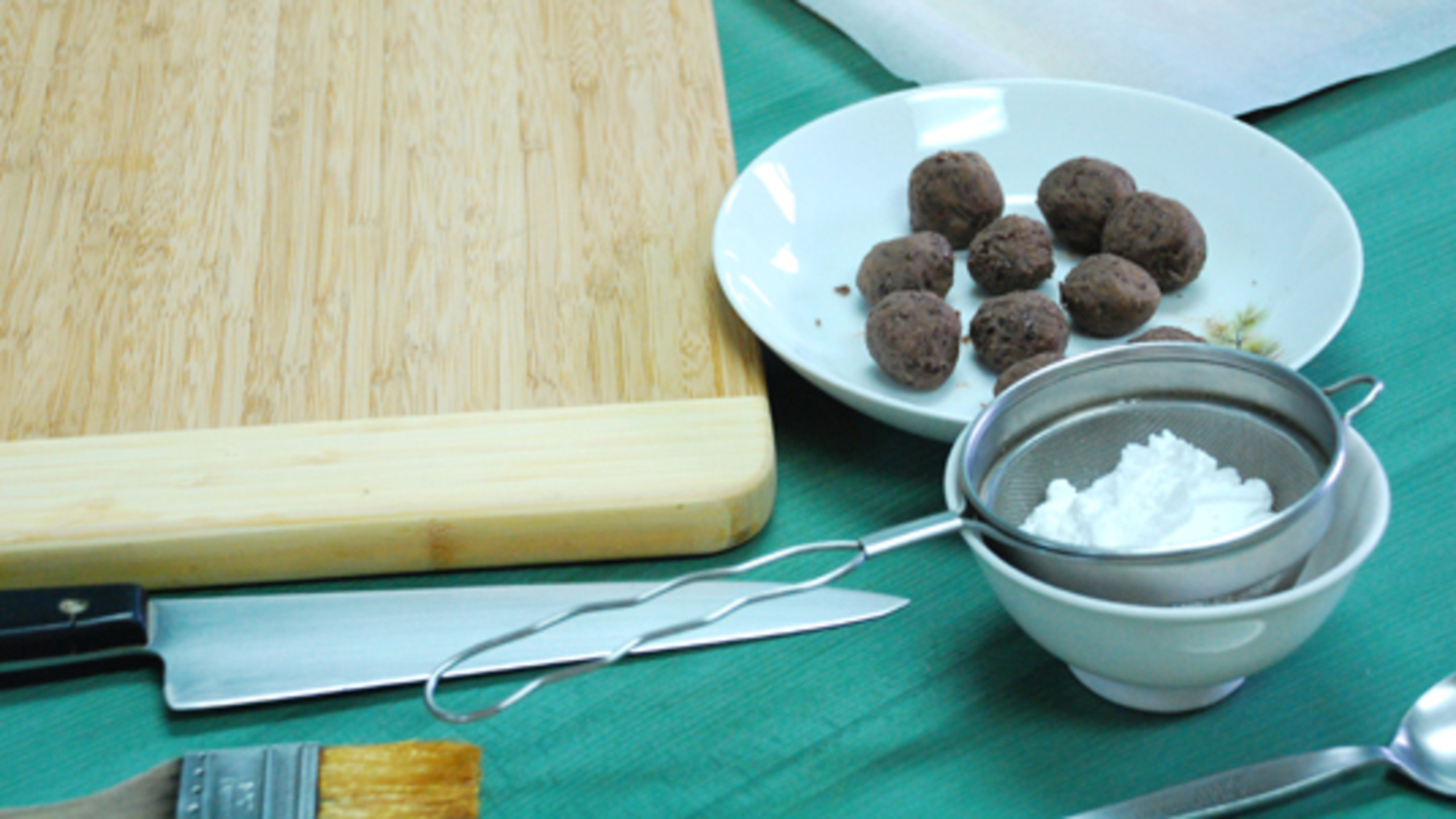 To start your mise en place, prepare the following: a large cutting board or a sheet pan, a strainer with bowl underneath (for the rice flour or cornstarch), a pastry brush, a large knife or pastry scraper, plate dusted with flour/starch and a silicone spatula.