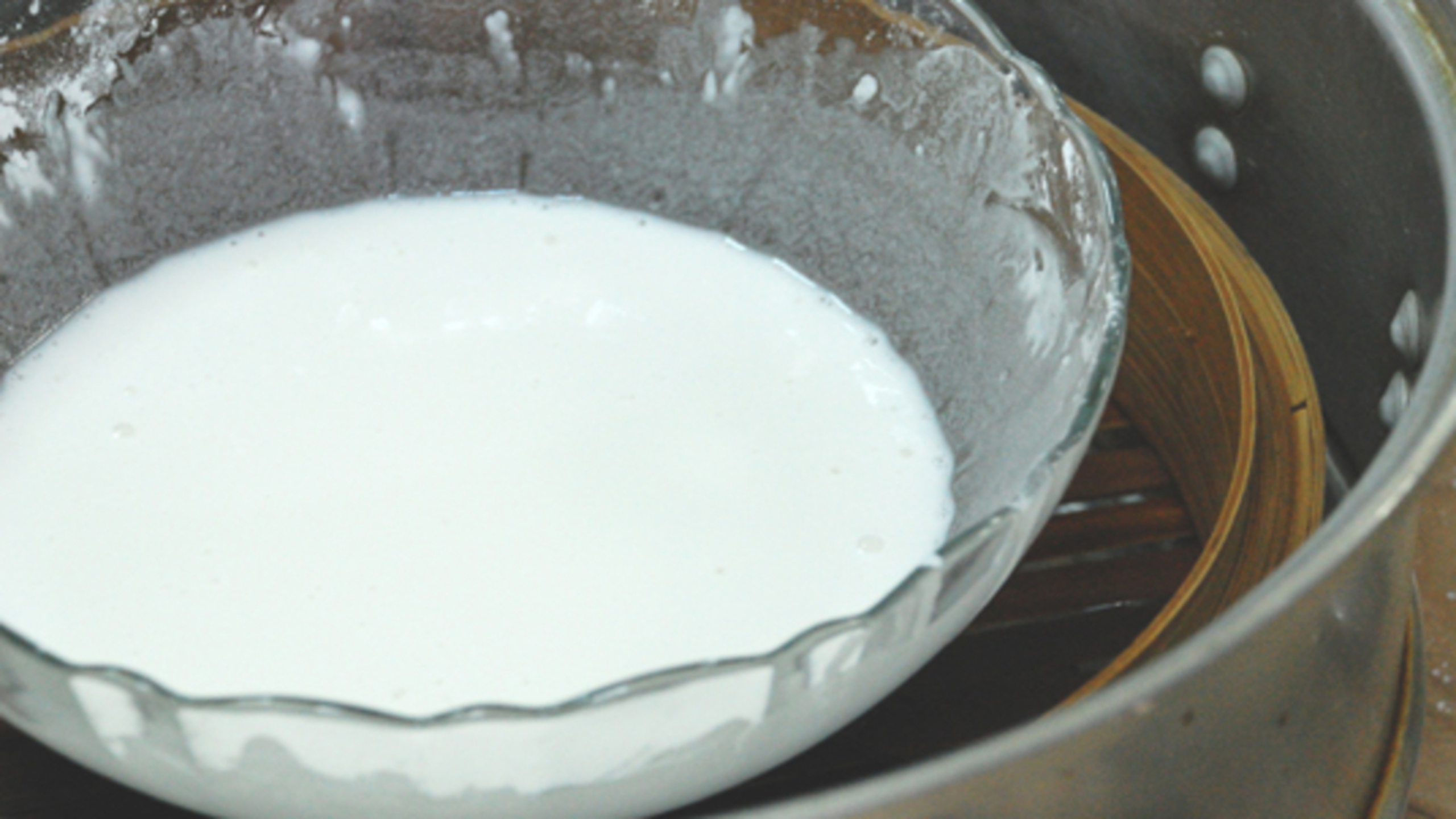 To steam the dough, place the bowl in a prepared steamer and cover with cloth. Steam the mixture for about 12-15 minutes, stirring once or twice until the dough is thick and translucent.