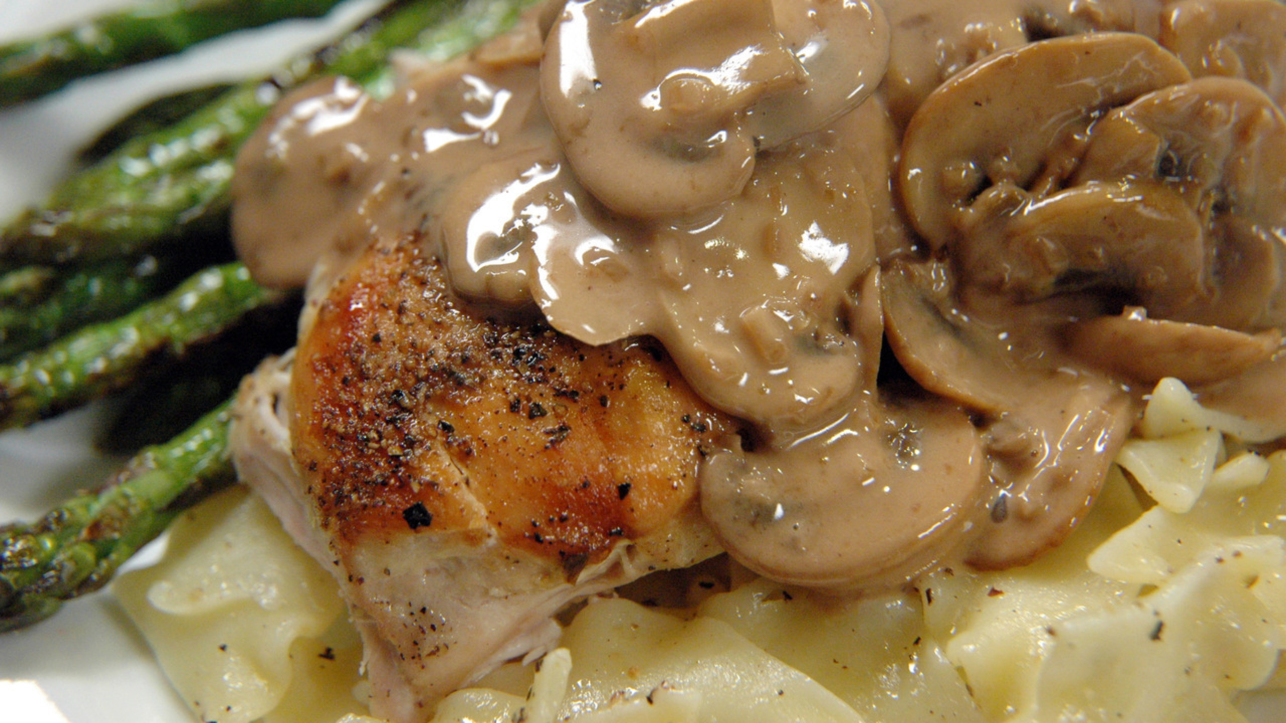 To serve the dish, spoon the mushroom sauce over the chicken breasts. This goes with particularly well with pasta noodles and Sauteed French Green Beans or Grilled Asparagus.