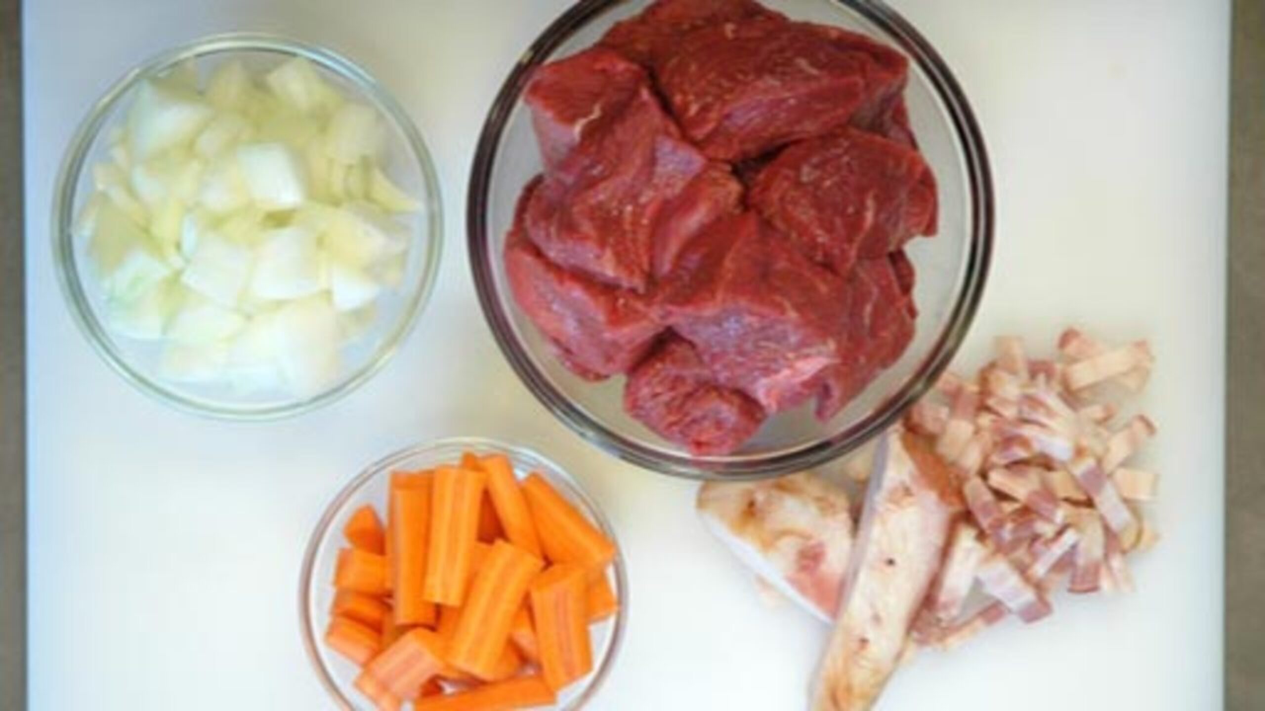Remove the rind from the bacon. Cut the bacon into lardons and set both aside.