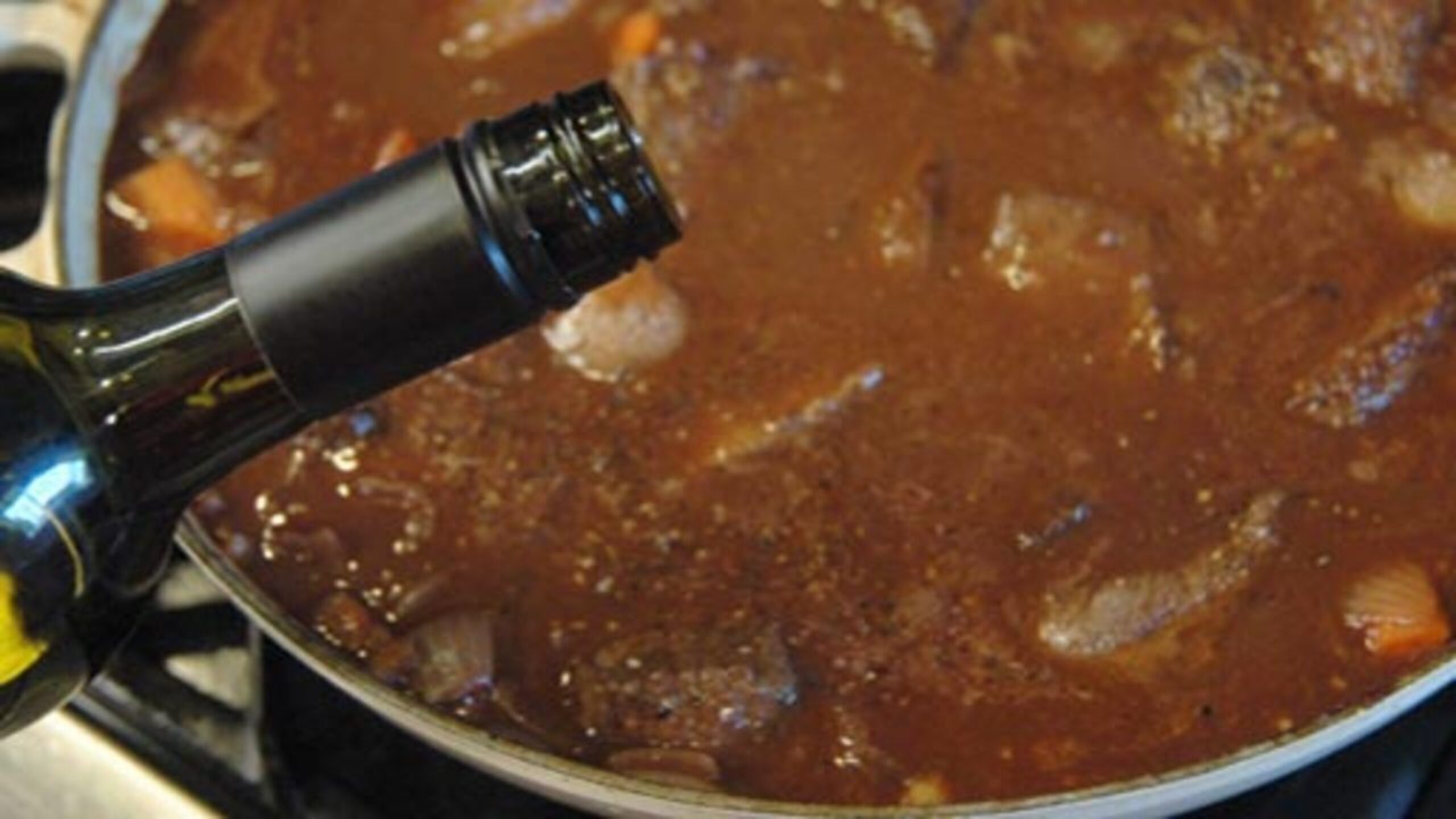 Add the red wine and stock to the pot. The ingredients should just be covered with the liquid. If you need to add more liquid, add equal amounts of wine and stock.