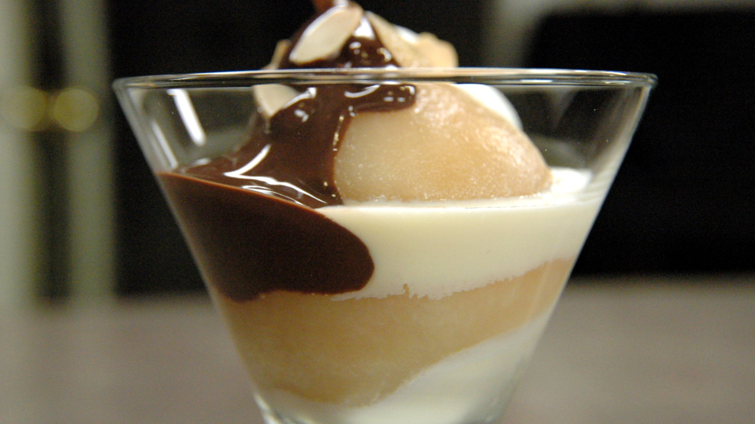 To assemble the dish, place a scoop of vanilla ice cream in the bottom of a serving glass or bowl. Place a poached pear over top. Drizzle with warm chocolate sauce.