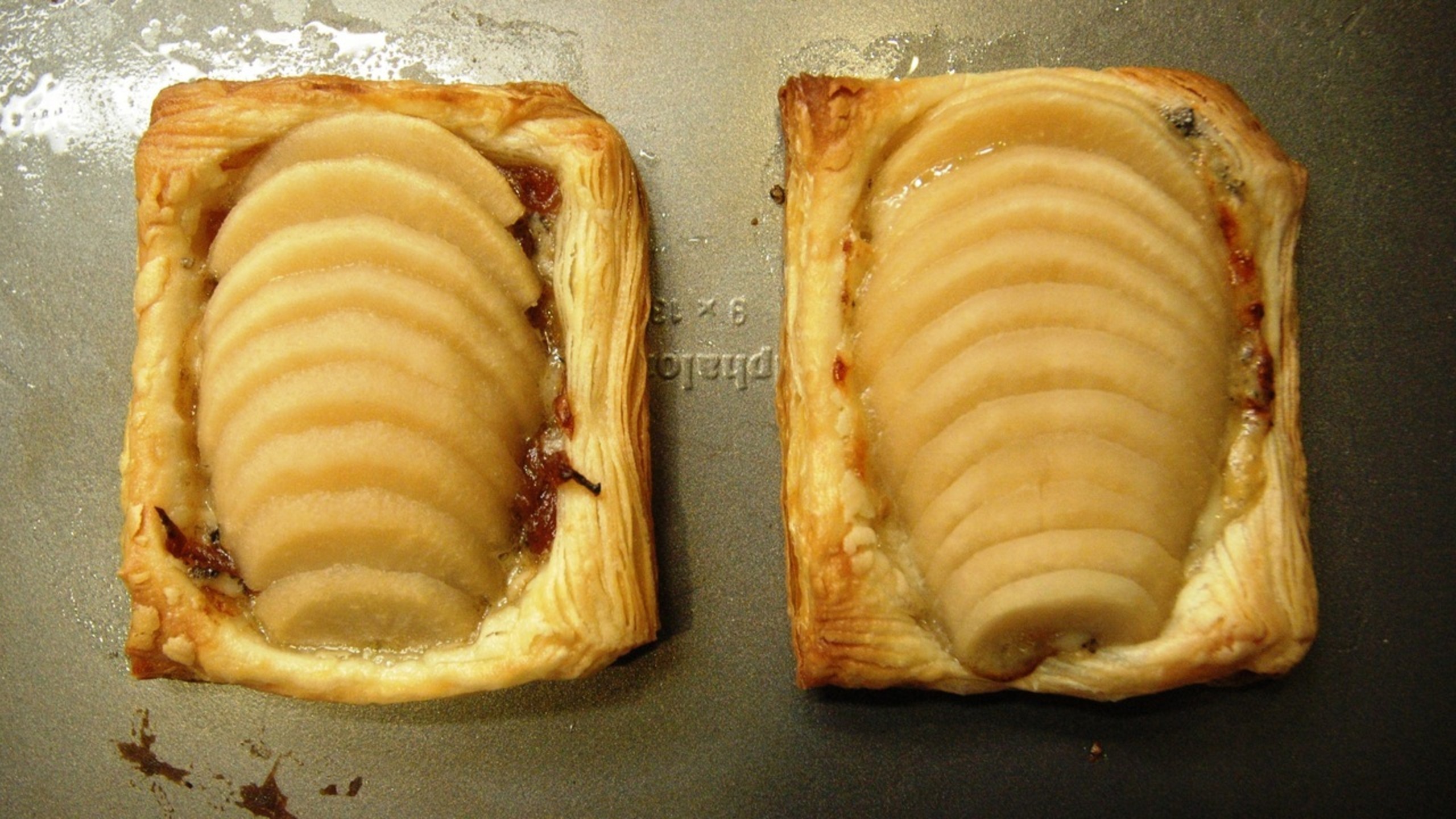 Spread about 1 teaspoon of Dijon onto the surface of each rectangle (leaving a clean border about 1/2" -inch or so wide). Divide the blue cheese among the four tarts and spread out evenly. Place the caramelized onions over top. Place a pear on top, fanning it out slightly. Finally, add a few dabs of butter over top each pear.