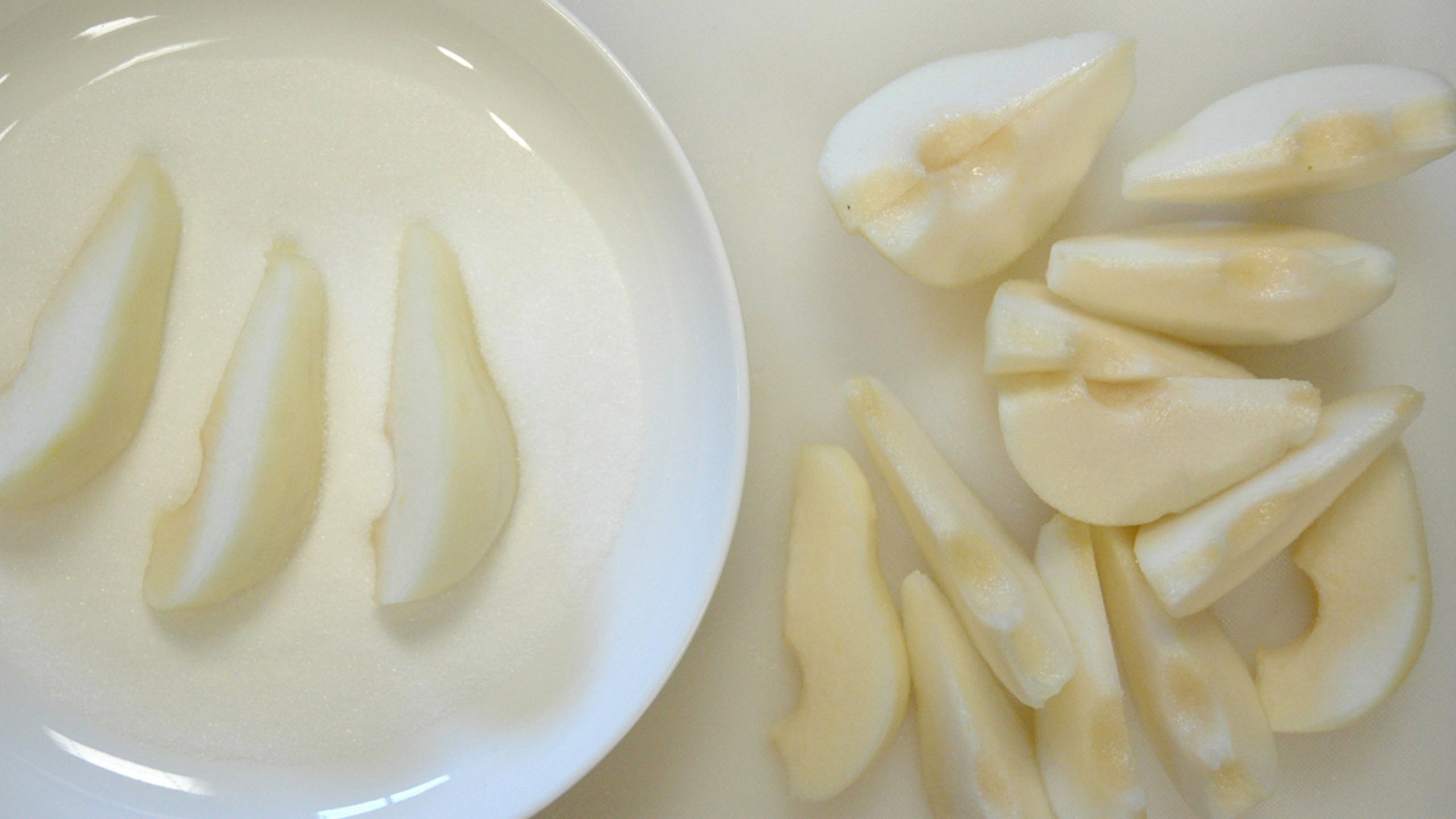 While the pan is heating, place the sugar into a flat bowl (or plate). Lightly coat the pears with the sugar.