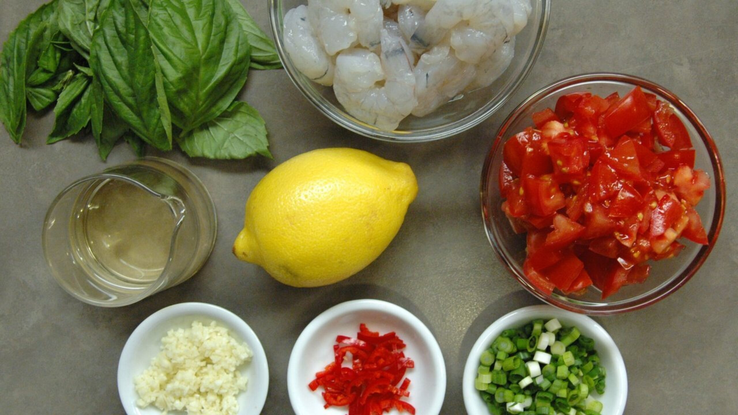 Finely slice the scallions and cut the tomato into large dice. For a more refined sauce, you can peel the tomato before dicing. Then gather the white wine, lemon and basil and set aside. Finally, peel and devein the shrimp, if necessary, and set aside.