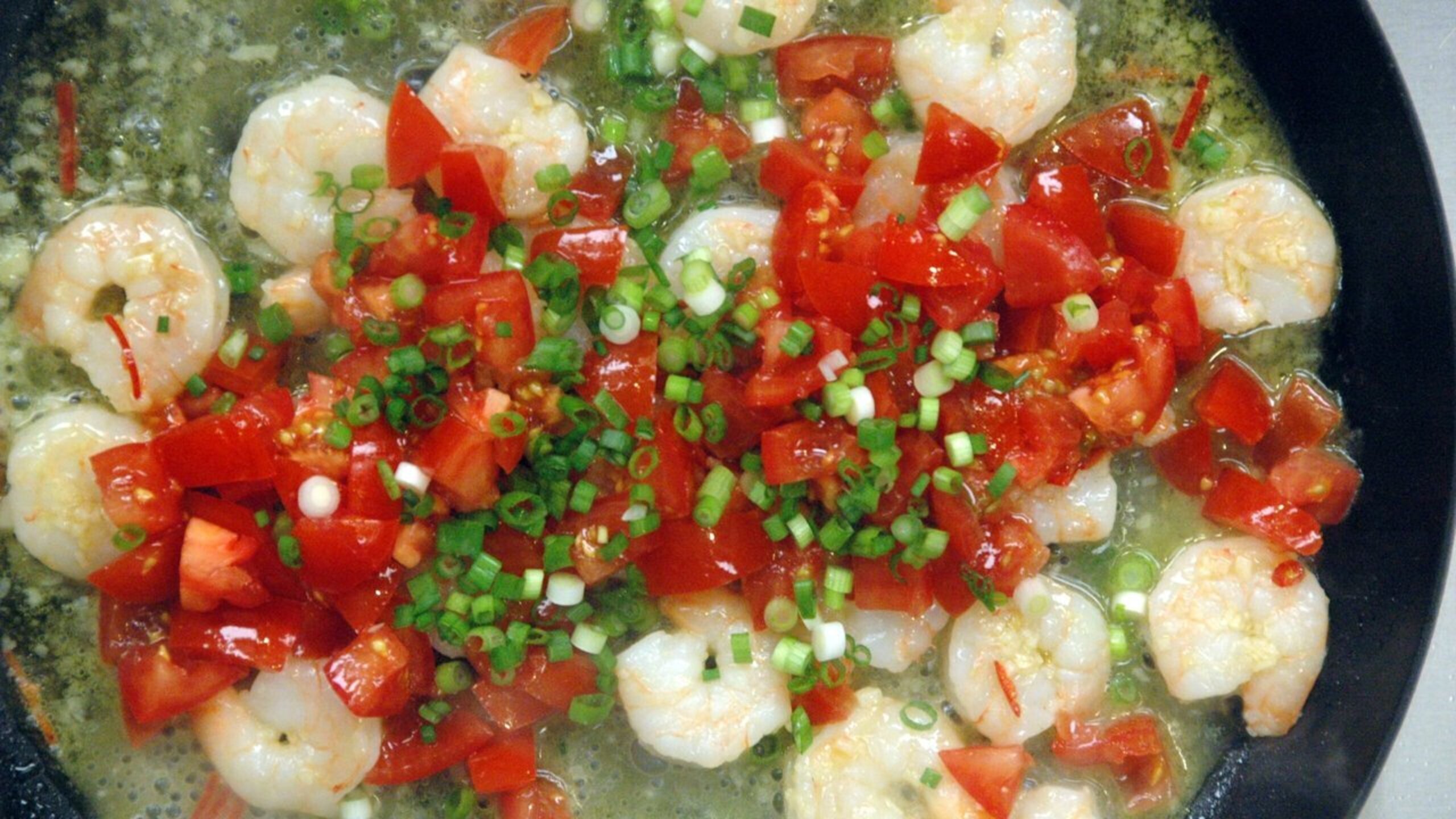 While the pasta is cooking, add the olive oil to the pan. Once hot, add the chilies and garlic. Let cook for about 30 seconds, making sure not to brown the garlic. Add the shrimp and season with a bit of salt to taste. Toss to coat with the garlic, chilies and olive oil and then add the white wine. Let simmer and reduce for about one minute. Next, add the tomatoes and scallions along with a pinch of salt. Chiffonade the basil and add half of it to the pan. Toss and let cook for another minute or so.