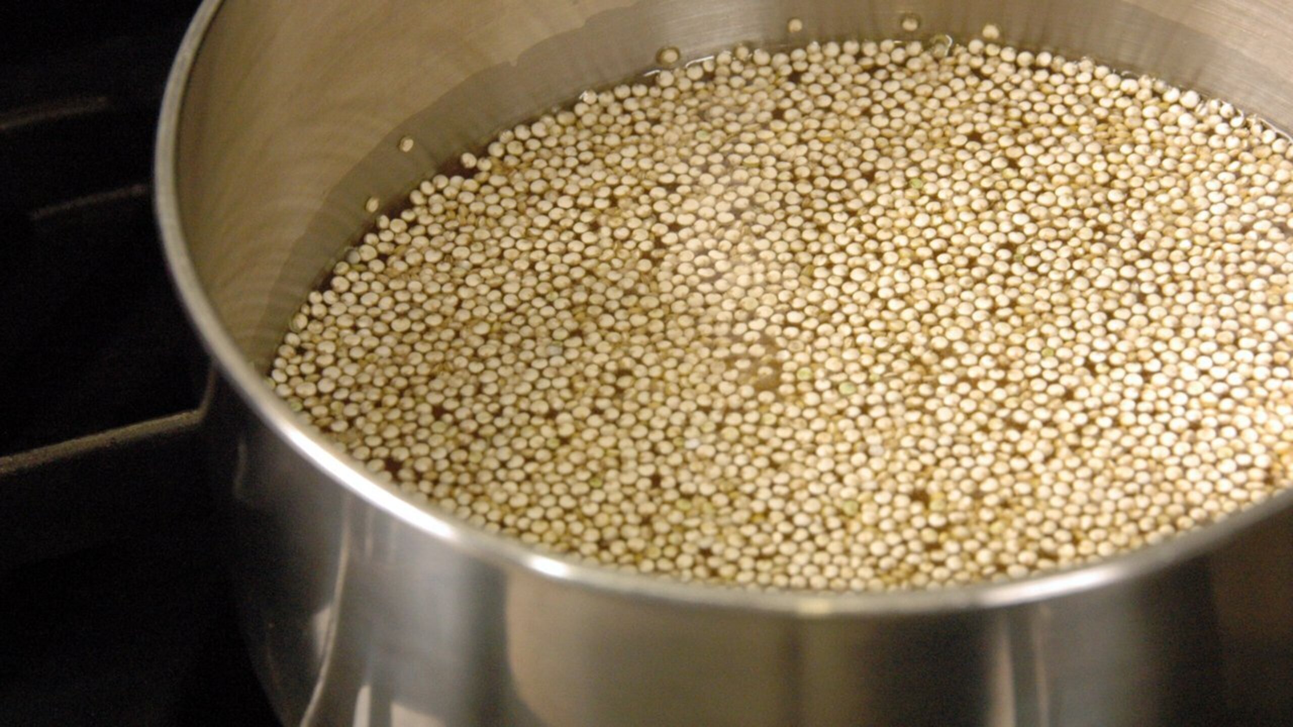 NOTE: Quinoa is coated with saponins, a bitter-tasting compound that deters birds and other animals from eating the seeds. To remove the saponins, rinse the quinoa thoroughly under cold running water in a fine-mesh strainer until the water runs clear and no longer appears frothy. This means the saponins have been washed away. You can also soak the quinoa in fresh water for 10-15 minutes before rinsing, which loosens the saponins and reduces rinsing time (and also saves water).