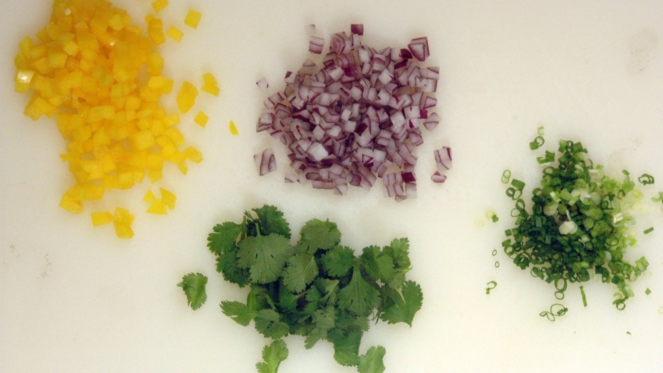 Finely dice the red onion, slice the green onions. Seed and dice the tomatoes, and small dice the zucchini and cucumber. Roughly chop the cilantro and set everything aside.