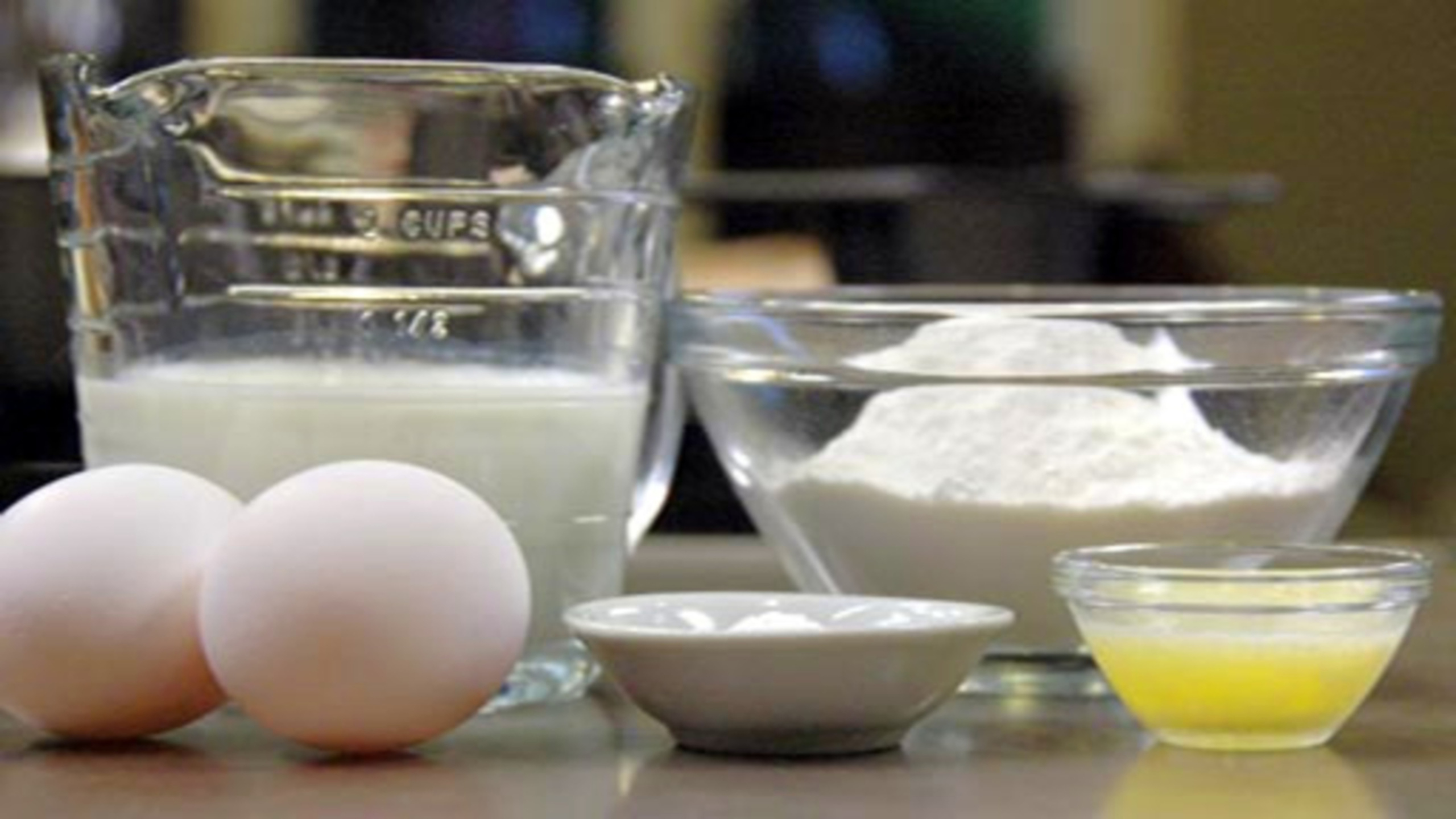 If you are in a hurry, place the eggs into a bowl of warm water. Also, place the milk in its container into another container of warm water. The warm water will speed up the process of bringing the ingredients to room temperature.