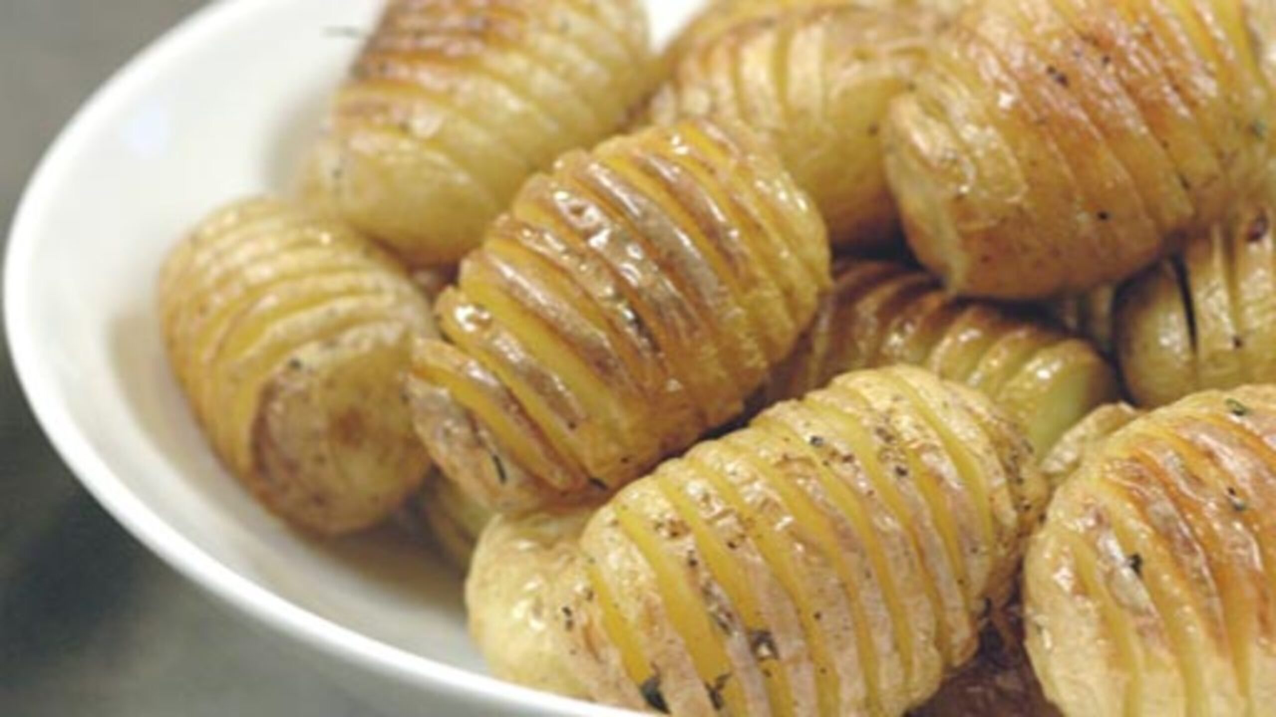 Using a small pairing knife, cut each potato across the width, into about 1/4" -inch slices. Stop just before you reach the bottom, so the potato stays intact at the base.