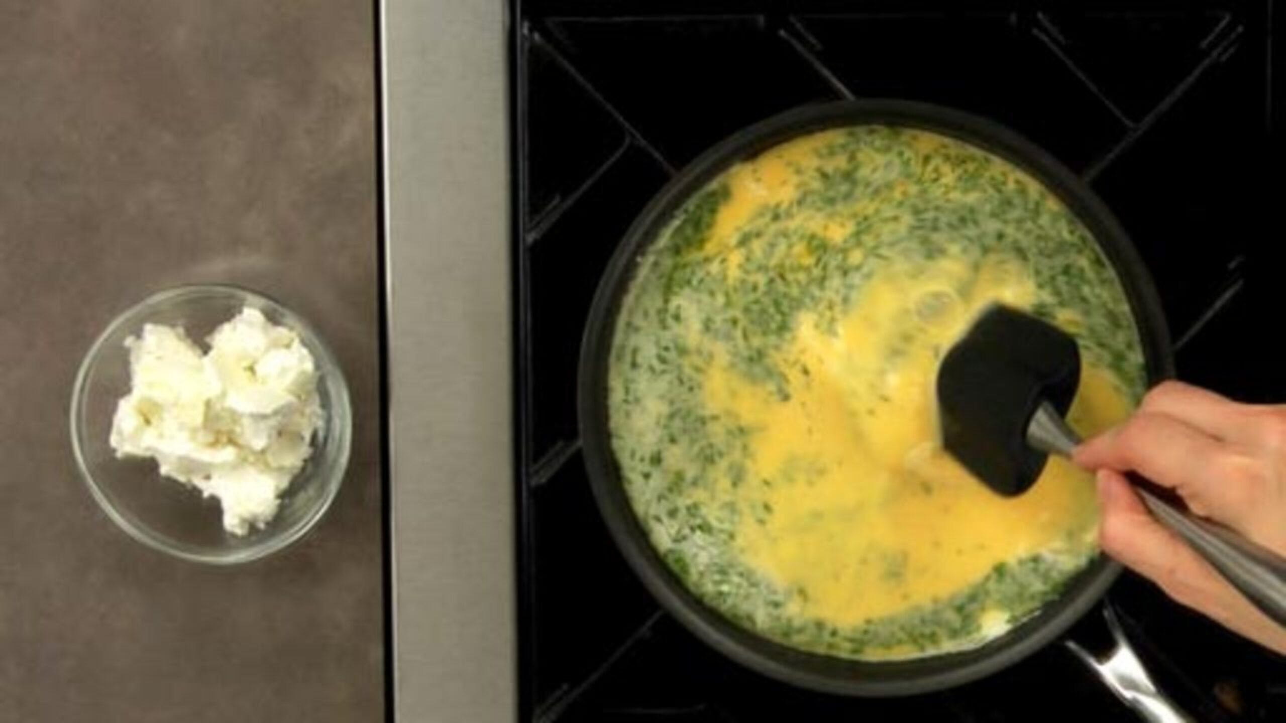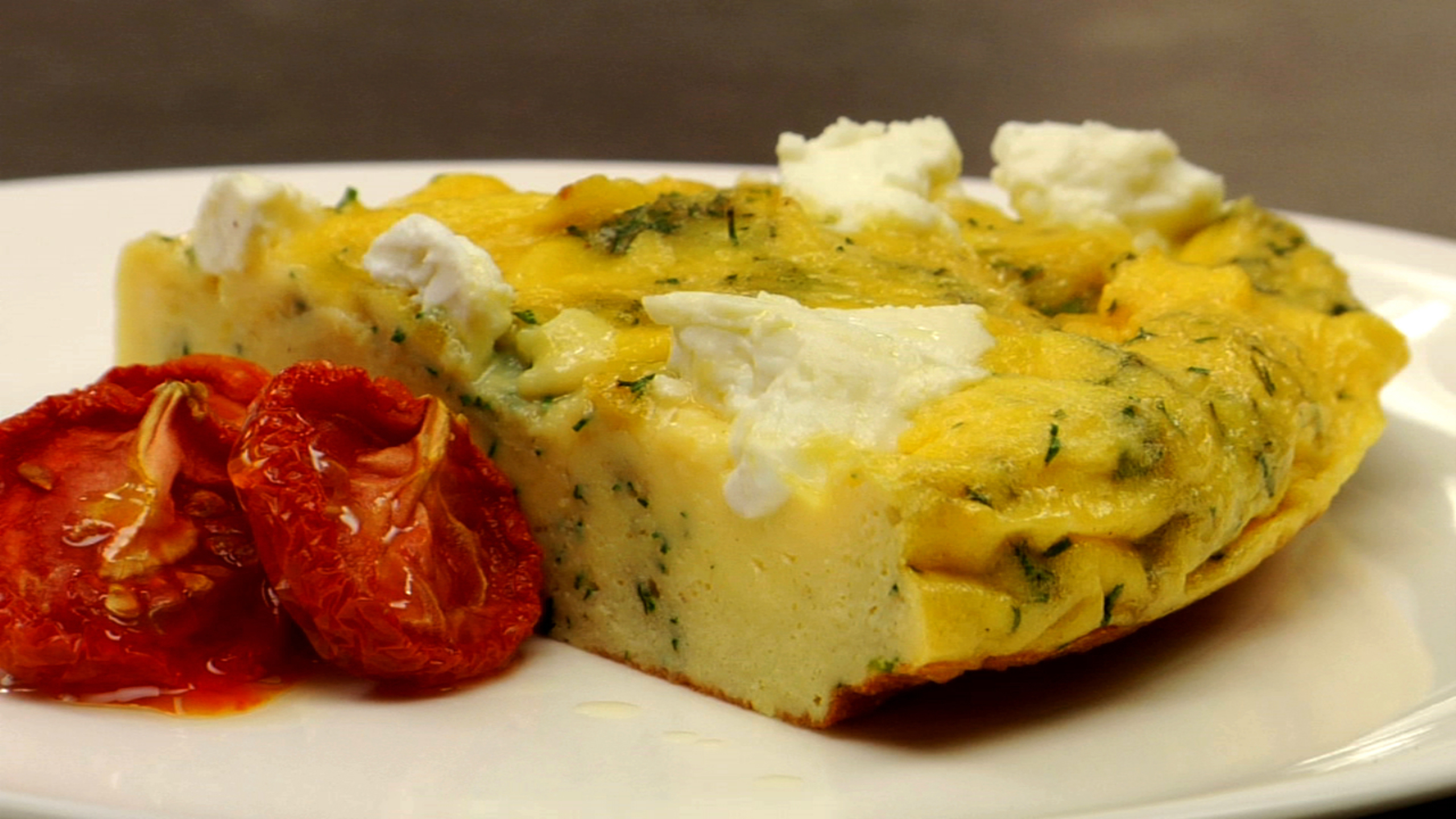 Slowly cook the frittata until it is cooked about half way through. There should be cooked egg scattered throughout with wet (not runny) egg in between.