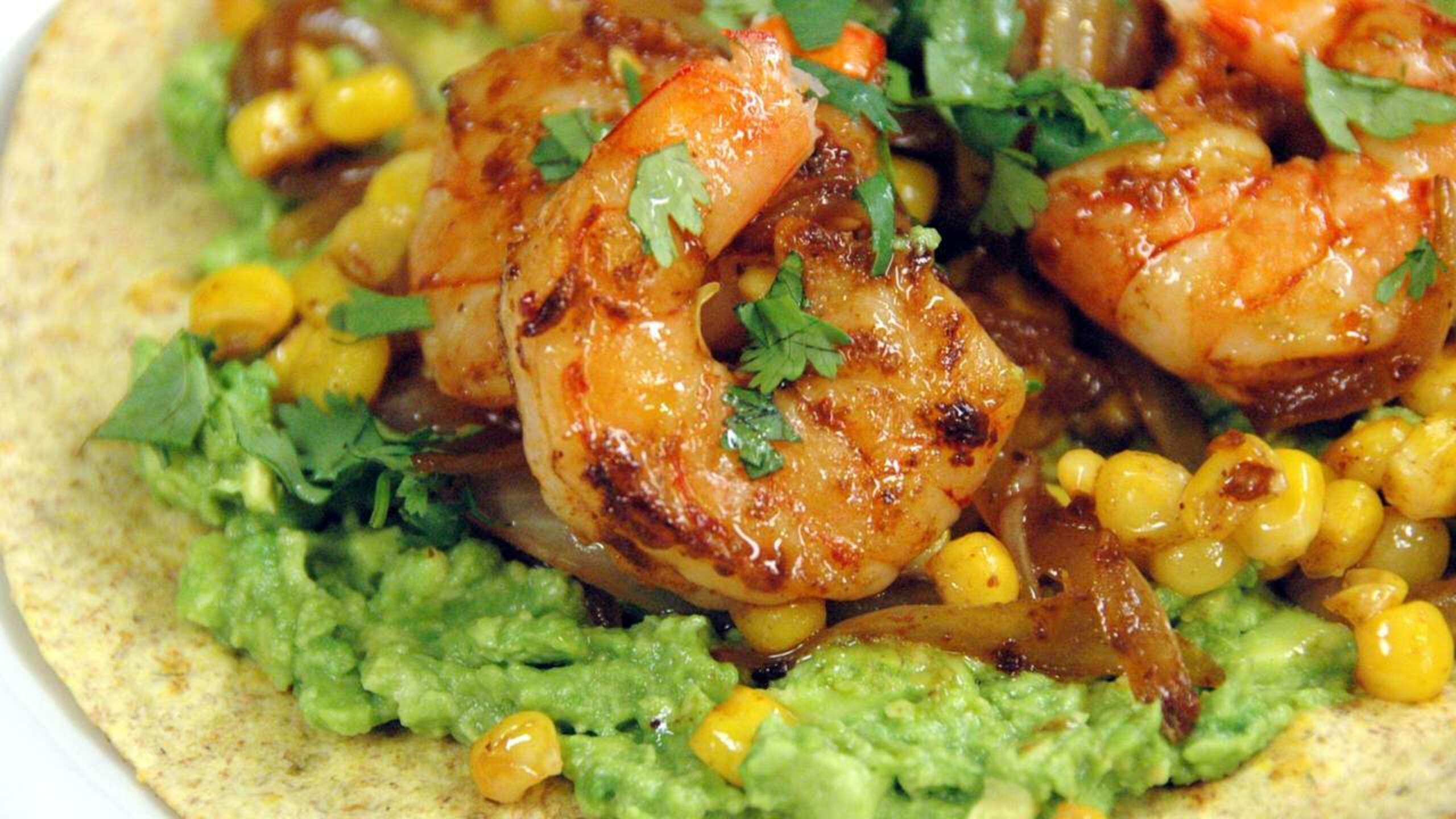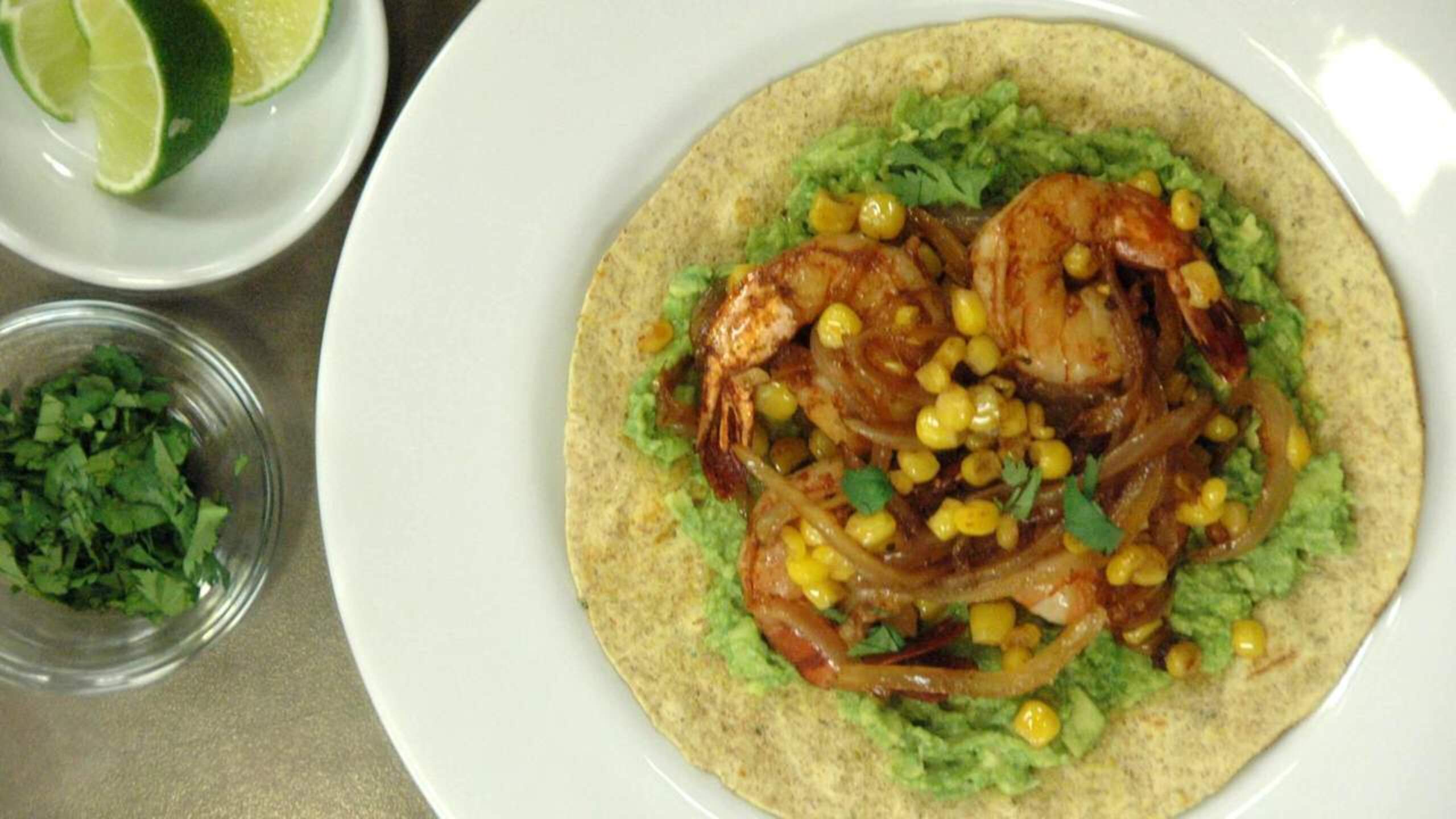 To assemble the fajitas, be sure the tortillas are warm. Spread a bit of avocado onto each tortilla, along with a scoop of the prawn and corn mixture. Top with a few sprigs of fresh cilantro and a squeeze of fresh lime, if desired.