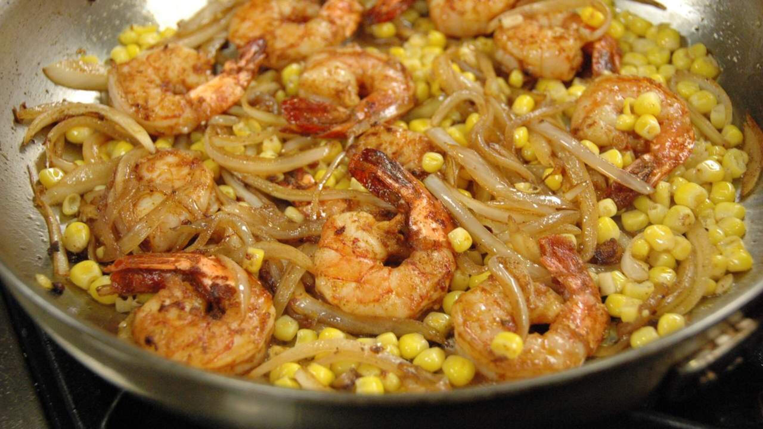 Once the onions have cooked, add the garlic and cook for about 30 seconds. Next, add the corn and the reserved prawns to the pan and cook for another 2 or 3 minutes, to heat everything through.