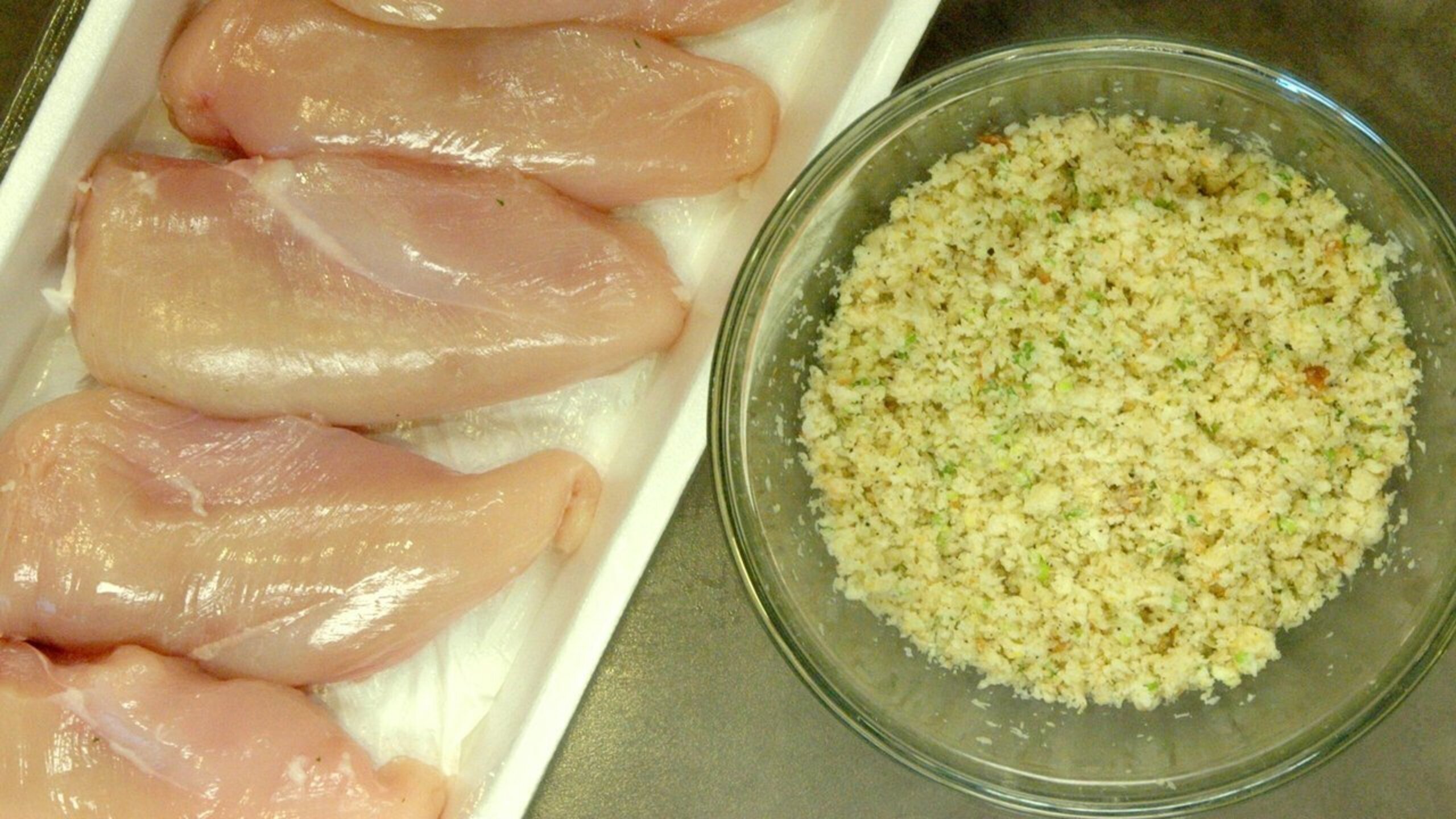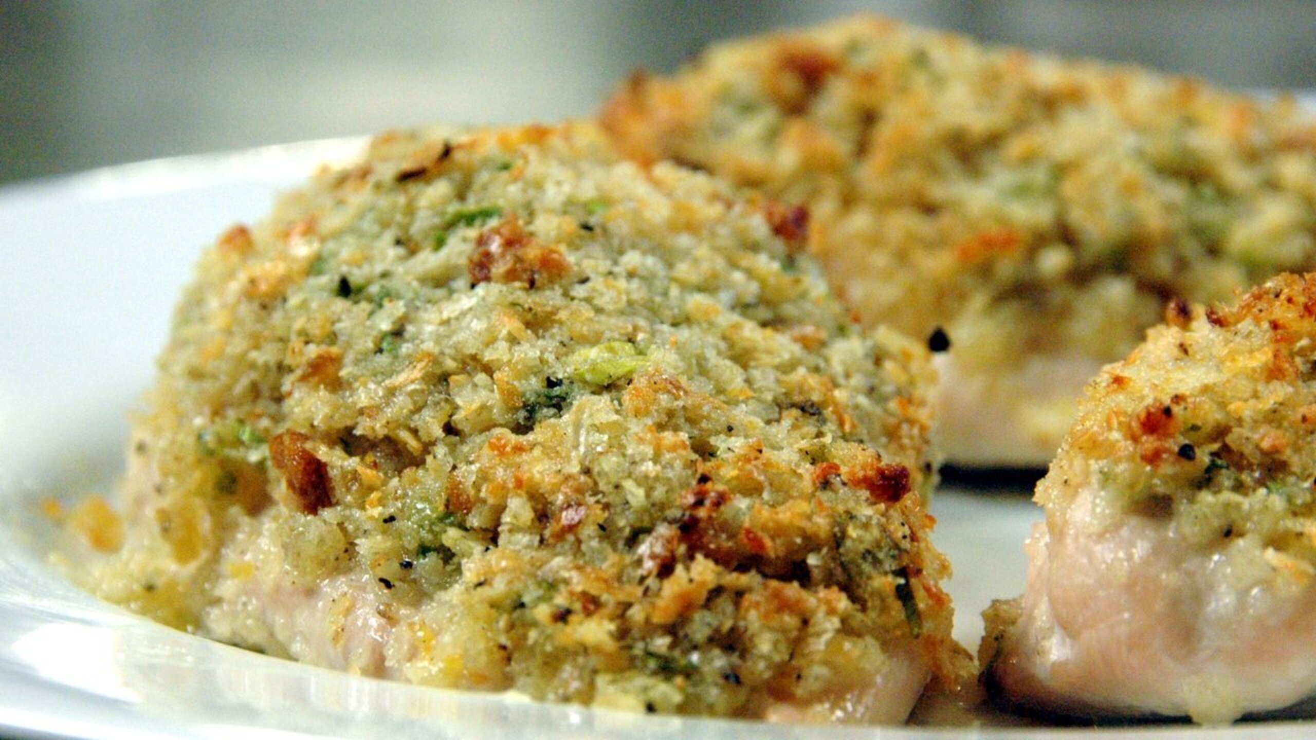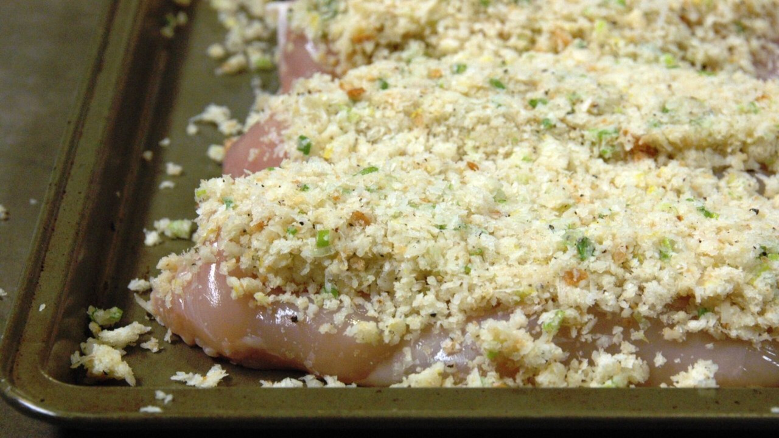 Divide the crumb mixture between the breasts and press evenly over the top.