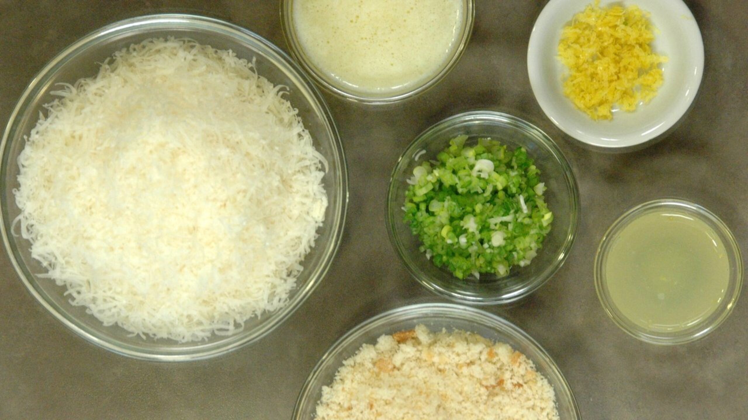 Next, finely grate the Parmesan cheese and finely chop the green onions. Melt the butter. Zest half of the lemon. Juice half of the lemon and reserve for making the sauce.