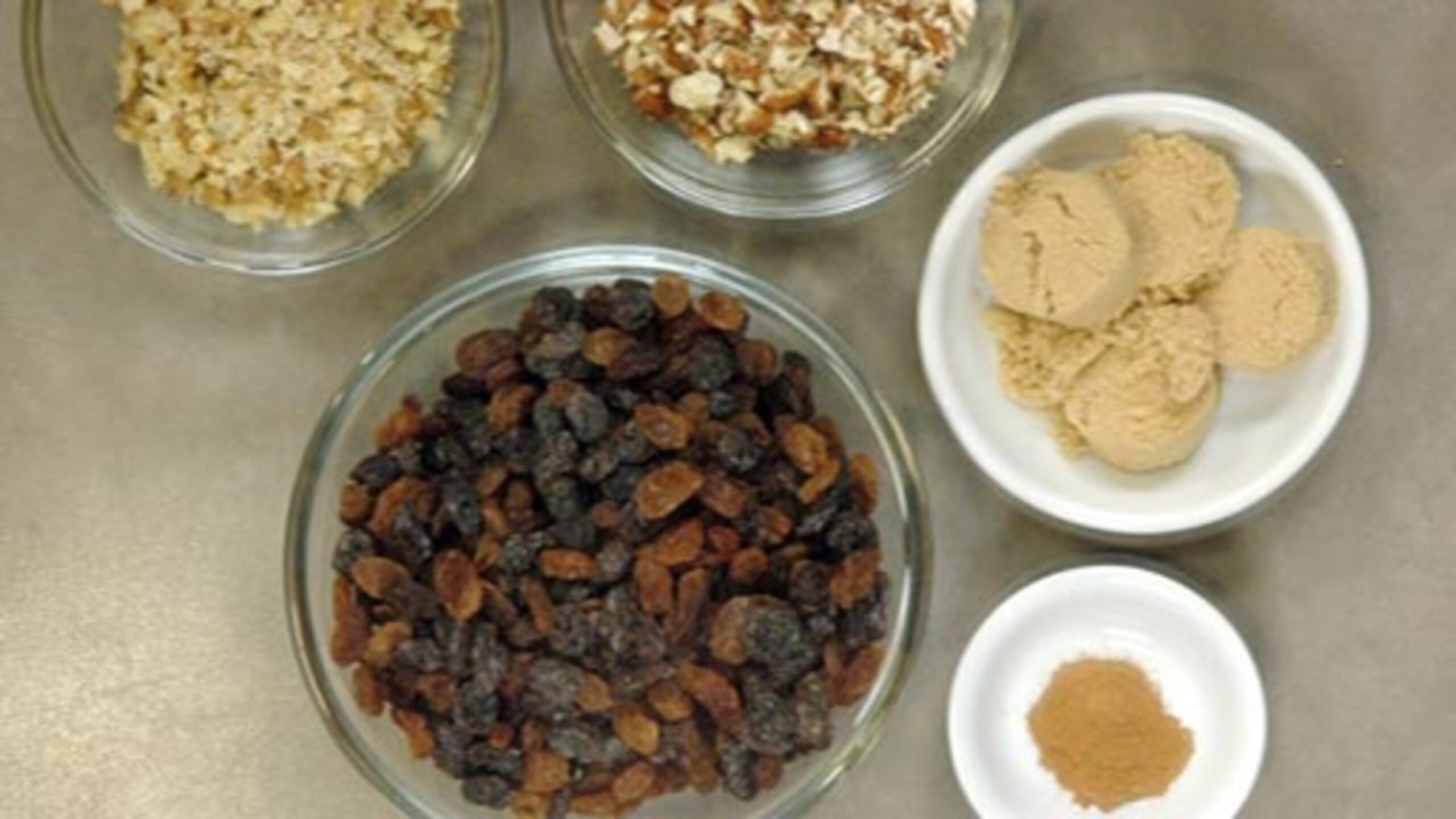 To prepare the rest of your mise en place, roughly chop the nuts and gather the raisins, brown sugar and cinnamon. Set everything aside.